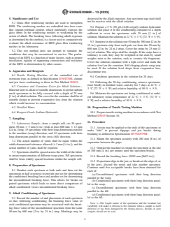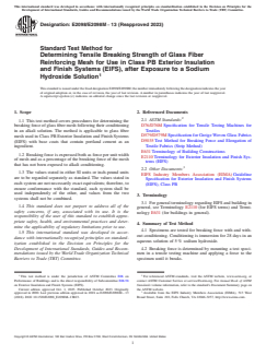 ASTM E2098/E2098M-13(2023) is a standard published by ASTM International. Its full title is "Standard Test Method for Determining Tensile Breaking Strength of Glass Fiber Reinforcing Mesh for Use in Class PB Exterior Insulation and Finish Systems (EIFS), after Exposure to a Sodium Hydroxide Solution". This standard covers: SIGNIFICANCE AND USE 5.1 Glass fiber reinforcing meshes are used to strengthen EIFS. The reinforcing meshes are embedded into base coats that contain portland cement, which potentially exposes the glass fibers in the reinforcing meshes to weakening by the action of alkali. The breaking force following alkali exposure as determined by this method, is a factor used to comparatively evaluate the alkali resistance of EIFS glass fiber reinforcing meshes in the laboratory. 5.2 This test method does not purport to simulate the conditions that may be encountered in service. The performance of an EIFS is a function of many factors, such as proper installation, rigidity of supporting construction and resistance of the EIFS to deterioration by other causes. SCOPE 1.1 This test method covers procedures for determining the breaking force of glass fiber mesh following their conditioning in an alkali solution. The method is applicable to glass fiber mesh used in Class PB Exterior Insulation and Finish Systems (EIFS) with base coats that contain portland cement as an ingredient. 1.2 Breaking force is expressed both as force per unit width of mesh and as a percentage of the breaking force of the mesh that has not been exposed to alkali conditioning. 1.3 The values stated in either SI units or inch-pound units are to be regarded separately as standard. The values stated in each system are not necessarily exact equivalents; therefore, to ensure conformance with the standard, each system shall be used independently of the other, and values from the two systems shall not be combined. 1.4 This standard does not purport to address all of the safety concerns, if any, associated with its use. It is the responsibility of the user of this standard to establish appropriate safety, health, and environmental practices and determine the applicability of regulatory limitations prior to use. 1.5 This international standard was developed in accordance with internationally recognized principles on standardization established in the Decision on Principles for the Development of International Standards, Guides and Recommendations issued by the World Trade Organization Technical Barriers to Trade (TBT) Committee.