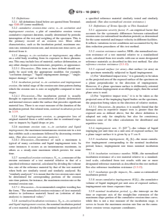 SIGNIFICANCE AND USE 5.1 Erosion Environments—This test method may be used for evaluating the erosion resistance of materials for service environments where solid surfaces are subjected to repeated impacts by liquid drops or jets. Occasionally, liquid impact tests have also been used to evaluate materials exposed to a cavitating liquid environment. The test method is not intended nor applicable for evaluating or predicting the resistance of materials against erosion due to solid particle impingement, due to “impingement corrosion” in bubbly flows, due to liquids or slurries “washing” over a surface, or due to continuous high-velocity liquid jets aimed at a surface. For background on various forms of erosion and erosion tests, see Refs (1) through (2).4 Ref (3) is an excellent comprehensive treatise. 5.2 Discussion of Erosion Resistance—Liquid impingement erosion and cavitation erosion are, broadly speaking, similar processes and the relative resistance of materials to them is similar. In both, the damage is associated with repeated, small-scale, high-intensity pressure pulses acting on the solid surface. The precise failure mechanisms in the solid have been shown to differ depending on the material, and on the detailed nature, scale, and intensity of the fluid-solid interactions (Note 1). Thus, “erosion resistance” should not be regarded as one precisely-definable property of a material, but rather as a complex of properties whose relative importance may differ depending on the variables just mentioned. (It has not yet been possible to successfully correlate erosion resistance with any independently measurable material property.) For these reasons, the consistency between relative erosion resistance as measured in different facilities or under different conditions is not very good. Differences between two materials of say 20 % or less are probably not significant: another test might well show them ranked in reverse order. For bulk materials such as metals and structural plastics, the... SCOPE 1.1 This test method covers tests in which solid specimens are eroded or otherwise damaged by repeated discrete impacts of liquid drops or jets. Among the collateral forms of damage considered are degradation of optical properties of window materials, and penetration, separation, or destruction of coatings. The objective of the tests may be to determine the resistance to erosion or other damage of the materials or coatings under test, or to investigate the damage mechanisms and the effect of test variables. Because of the specialized nature of these tests and the desire in many cases to simulate to some degree the expected service environment, the specification of a standard apparatus is not deemed practicable. This test method gives guidance in setting up a test, and specifies test and analysis procedures and reporting requirements that can be followed even with quite widely differing materials, test facilities, and test conditions. It also provides a standardized scale of erosion resistance numbers applicable to metals and other structural materials. It serves, to some degree, as a tutorial on liquid impingement erosion. 1.2 The values stated in SI units are to be regarded as standard. The values given in parentheses after SI units are provided for information only and are not considered standard. 1.3 This standard does not purport to address all of the safety concerns, if any, associated with its use. It is the responsibility of the user of this standard to establish appropriate safety, health, and environmental practices and determine the applicability of regulatory limitations prior to use. 1.4 This international standard was developed in accordance with internationally recognized principles on standardization established in the Decision on Principles for the Development of International Standards, Guides and Recommendations issued by the World Trade Organization Technical Barriers to Trade (TBT) Committee.