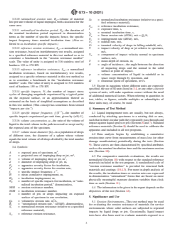 1.1 This test method covers tests in which solid specimens are eroded or otherwise damaged by repeated discrete impacts of liquid drops or jets. Among the collateral forms of damage considered are degradation of optical properties of window materials, and penetration, separation, or destruction of coatings. The objective of the tests may be to determine the resistance to erosion or other damage of the materials or coatings under test, or to investigate the damage mechanisms and the effect of test variables. Because of the specialized nature of these tests and the desire in many cases to simulate to some degree the expected service environment, the specification of a standard apparatus is not deemed practicable. This test method gives guidance in setting up a test, and specifies test and analysis procedures and reporting requirements that can be followed even with quite widely differing materials, test facilities, and test conditions. It also provides a standardized scale of erosion resistance numbers applicable to metals and other structural materials. It serves, to some degree, as a tutorial on liquid impingement erosion.