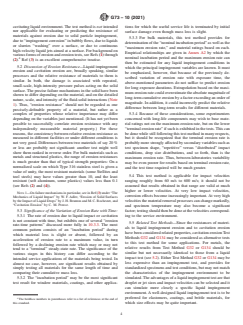 5.2 Discussion of Erosion Resistance—Liquid impingement erosion and cavitation erosion are, broadly speaking, similar processes and the relative resistance of materials to them is similar. In both, the damage is associated with repeated, small-scale, high-intensity pressure pulses acting on the solid surface. The precise failure mechanisms in the solid have been shown to differ depending on the material, and on the detailed nature, scale, and intensity of the fluid-solid interactions (Note 1). Thus, “erosion resistance” should not be regarded as one precisely-definable property of a material, but rather as a complex of properties whose relative importance may differ depending on the variables just mentioned. (It has not yet been possible to successfully correlate erosion resistance with any independently measurable material property.) For these reasons, the consistency between relative erosion resistance as measured in different facilities or under different conditions is not very good. Differences between two materials of say 20 % or less are probably not significant: another test might well show them ranked in reverse order. For bulk materials such as metals and structural plastics, the...