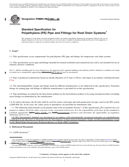 The scope covers requirements for virgin PE materials, stabilizers, and antioxidants, as well as criteria for chemical resistance, water absorption, system integrity, mechanical properties, appearance, and markings. The standard also details approved joining methods for pipe and fittings, including heat fusion, electrofusion, and mechanical joints. This specification aims to provide clear guidance for manufacturers, installers, design professionals, and regulators engaged in roof drainage systems.