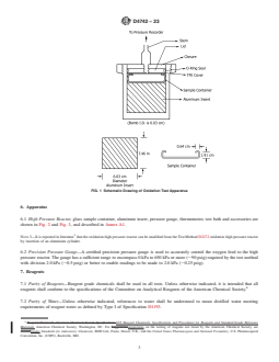 ASTM D4742-23 is a standard published by ASTM International. Its full title is "Standard Test Method for Oxidation Stability of Gasoline Automotive Engine Oils by Thin-Film Oxygen Uptake (TFOUT)". This standard covers: SIGNIFICANCE AND USE 5.1 This test method is used to evaluate oxidation stability of lubricating base oils with additives in the presence of chemistries similar to those found in gasoline engine service. Test results on some ASTM reference oils have been found to correlate with sequence IIID engine test results in hours for a 375 % viscosity increase.5 The test does not constitute a substitute for engine testing, which measures wear, oxidation stability, volatility, and deposit control characteristics of lubricants. Properly interpreted, the test may provide input on the oxidation stability of lubricants under simulated engine chemistry. 5.2 This test method is intended to be used as a bench screening test and quality control tool for lubricating base oil manufacturing, especially for re-refined lubricating base oils. This test method is useful for quality control of oxidation stability of re-refined oils from batch to batch. 5.3 This test method is useful for screening formulated oils prior to engine tests. Within similar additive chemistry and base oil types, the ranking of oils in this test appears to be predictive of ranking in engine tests. When oils having completely different additive chemistry or base oil type are compared, oxidation stability results may not reflect the actual engine test result. 5.4 Other oxidation stability test methods have demonstrated that soluble metal catalyst supplies are very inconsistent and they have significant effects on the test results. Thus, for test comparisons, the same source and same batch of metal naphthenates shall be used. Note 2: It is also recommended as a good research practice not to use different batches of the fuel component in test comparisons. SCOPE 1.1 This test method evaluates the oxidation stability of engine oils for gasoline automotive engines. This test, run at 160 °C, utilizes a high pressure reactor pressurized with oxygen along with a metal catalyst package, a fuel catalyst, and water in a partial simulation of the conditions to which an oil may be subjected in a gasoline combustion engine. This test method can be used for engine oils with viscosity in the range from 4 mm2/s (cSt) to 21 mm2/s (cSt) at 100 °C, including re-refined oils. 1.2 This test method is not a substitute for the engine testing of an engine oil in established engine tests, such as Sequence IIID. 1.3 The values stated in SI units are to be regarded as standard. No other units of measurement are included in this standard. 1.3.1 Exception—Pressure units are provided in psig, and dimensions are provided in inches in Annex A1, because these are the industry accepted standard and the apparatus is built according to the figures shown. 1.4 This standard does not purport to address all of the safety concerns, if any, associated with its use. It is the responsibility of the user of this standard to establish appropriate safety, health, and environmental practices and determine the applicability of regulatory limitations prior to use. For specific warning statements, see Sections 7 and 8. 1.5 This international standard was developed in accordance with internationally recognized principles on standardization established in the Decision on Principles for the Development of International Standards, Guides and Recommendations issued by the World Trade Organization Technical Barriers to Trade (TBT) Committee.