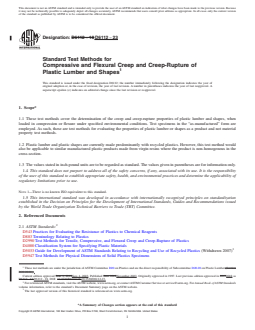SIGNIFICANCE AND USE 5.1 Data from creep and creep-rupture tests are necessary to predict the creep modulus and strength of materials under long-term loads and to predict dimensional changes that have the potential to occur as a result of such loads. 5.2 Data from these test methods can be used to characterize plastic lumber: for comparison purposes, for the design of fabricated parts, to determine long-term performance under constant load, and under certain conditions, for specification purposes. 5.3 For many products, it is possible that there will be a specification that requires the use of this test method, but with some procedural modifications that take precedence when adhering to the specification. Therefore, it is advisable to refer to that product specification before using this test method. Table 1 in Classification D4000 lists the ASTM materials standards that currently exist. SCOPE 1.1 These test methods cover the determination of the creep and creep-rupture properties of plastic lumber and shapes, when loaded in compression or flexure under specified environmental conditions. Test specimens in the “as-manufactured” form are employed. As such, these are test methods for evaluating the properties of plastic lumber or shapes as a product and not material property test methods. 1.2 Plastic lumber and plastic shapes are currently made predominantly with recycled plastics. However, this test method would also be applicable to similar manufactured plastic products made from virgin resins where the product is non-homogenous in the cross-section. 1.3 The values stated in inch-pound units are to be regarded as standard. The values given in parentheses are for information only. 1.4 This standard does not purport to address all of the safety concerns, if any, associated with its use. It is the responsibility of the user of this standard to establish appropriate safety, health, and environmental practices and determine the applicability of regulatory limitations prior to use. Note 1: There is no known ISO equivalent to this standard. 1.5 This international standard was developed in accordance with internationally recognized principles on standardization established in the Decision on Principles for the Development of International Standards, Guides and Recommendations issued by the World Trade Organization Technical Barriers to Trade (TBT) Committee.