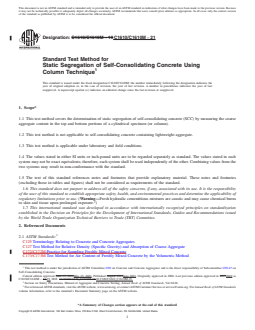 SIGNIFICANCE AND USE 5.1 This test method provides users with a procedure to determine the potential static segregation of self-consolidating concrete. Note 1: This test method may not be sufficiently rapid to evaluate self-consolidating concrete mixtures in the field before placement. Test Method C1712 provides a rapid method for assessing static segregation resistance of self-consolidating concrete. 5.2 This test method shall be used to develop self-consolidating concrete mixtures with segregation not exceeding specified limits. Self-consolidating concrete is a fluid concrete that can be prone to segregation if not proportioned to be cohesive. A cohesive self-consolidating concrete is important for all applications but is especially critical for deep-section applications such as walls or columns. Therefore, the degree of segregation can indicate if a mixture is suitable for the application. Note 2: Some level of segregation is tolerable as long as the desired strength and durability performance is achieved. SCOPE 1.1 This test method covers the determination of static segregation of self-consolidating concrete (SCC) by measuring the coarse aggregate content in the top and bottom portions of a cylindrical specimen (or column). 1.2 This test method is not applicable to self-consolidating concrete containing lightweight aggregate. 1.3 This test method is applicable under laboratory and field conditions. 1.4 The values stated in either SI units or inch-pound units are to be regarded separately as standard. The values stated in each system may not be exact equivalents; therefore, each system shall be used independently of the other. Combining values from the two systems may result in non-conformance with the standard. 1.5 The text of this standard references notes and footnotes that provide explanatory material. These notes and footnotes (excluding those in tables and figures) shall not be considered as requirements of the standard. 1.6 This standard does not purport to address all of the safety concerns, if any, associated with its use. It is the responsibility of the user of this standard to establish appropriate safety, health, and environmental practices and determine the applicability of regulatory limitations prior to use. (Warning—Fresh hydraulic cementitious mixtures are caustic and may cause chemical burns to skin and tissue upon prolonged exposure.2) 1.7 This international standard was developed in accordance with internationally recognized principles on standardization established in the Decision on Principles for the Development of International Standards, Guides and Recommendations issued by the World Trade Organization Technical Barriers to Trade (TBT) Committee.