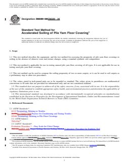 SIGNIFICANCE AND USE 5.1 This test method may be used to soil test specimens in the absence of abrasive wear and texture changes under controlled conditions using a standard synthetic soil, or as a preliminary step to other procedures. 5.2 This test method will provide a uniformly soiled test specimen to evaluate, is reproducible (see Section 11), and is economical for Testing Laboratories. 5.3 This test method has been found to give results similar to the actual floor service soiling, but its use is recommended only as a screening test method and not as a replacement for floor testing. 5.4 The acceptance criteria of this test method shall be set by mutual agreement between the purchaser and supplier. SCOPE 1.1 This test method describes the equipment, and the test method for assessing the propensity of pile yarn floor coverings to soiling in the absence of abrasive wear and texture changes, using a standard synthetic soil composition. 1.2 This test method is applicable for use in testing unused pile yarn floor covering of all types. It is not applicable for use in testing used pile yarn floor covering. 1.3 This test method can be used to compare the soiling propensity of two or more carpets; or it can be used to soil carpets as a preliminary step to other test procedures. 1.4 The values stated in inch-pound units are to be regarded as standard. The values given in parentheses are mathematical conversions to SI units that are provided for information only and are not considered standard. 1.5 This standard does not purport to address all of the safety concerns, if any, associated with its use. It is the responsibility of the user of this standard to establish appropriate safety, health, and environmental practices and determine the applicability of regulatory limitations prior to use. 1.6 This international standard was developed in accordance with internationally recognized principles on standardization established in the Decision on Principles for the Development of International Standards, Guides and Recommendations issued by the World Trade Organization Technical Barriers to Trade (TBT) Committee.