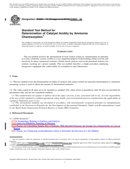 SIGNIFICANCE AND USE 5.1 This test method can be used to determine the acidity of catalysts and catalyst carriers by ammonia chemisorption for materials specifications, manufacturing control, and research and development in the evaluation of catalysts. SCOPE 1.1 This test method covers the determination of acidity of catalysts and catalyst carriers by ammonia chemisorption. A volumetric measuring system is used to obtain the amount of chemisorbed ammonia. 1.2 The values stated in SI units are to be regarded as standard. The values given in parentheses after SI units are provided for information only and are not considered standard. 1.3 This standard does not purport to address all of the safety concerns, if any, associated with its use. It is the responsibility of the user of this standard to establish appropriate safety, health, and environmental practices and determine the applicability of regulatory limitations prior to use. 1.4 This international standard was developed in accordance with internationally recognized principles on standardization established in the Decision on Principles for the Development of International Standards, Guides and Recommendations issued by the World Trade Organization Technical Barriers to Trade (TBT) Committee.