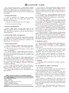 ABSTRACT This specification covers the general physical property requirements of radiant barrier materials for use in building construction. The scope is specifically limited to requirements for radiant barrier sheet materials that consist of at least one surface, such as metallic foils or metallic deposits mounted or unmounted on substrates. Sheet radiant barrier materials shall consist of low emittance surface(s) that may be in combination with any substrates and adhesives required to meet the specified physical material properties. The following test methods shall be performed: surface emittance; water vapor transmission; surface burning characteristics; corrosivity; tear resistance; and adhesive performance. SIGNIFICANCE AND USE 8.1 This specification recognizes that the effectiveness of a sheet radiant barrier is dependent on proper installation. Practices C1743 and C1744 address use and installation of radiant barriers. 8.2 This specification identifies the material properties that are important for sheet radiant barrier products. When appropriate, values for the properties have been stated. 8.3 When specific material properties are required for a particular application the user shall consult the manufacturer. 8.4 Radiant barriers shall be free of dust or other contaminants to remain effective. SCOPE 1.1 This specification covers the general physical property requirements of radiant barrier materials for use in building construction. The scope is specifically limited to requirements for radiant barrier sheet materials that consist of at least one surface having a far-infrared emittance of 0.1 or less, such as metallic foils or metallic deposits mounted or unmounted on substrates. 1.2 The values stated in either SI units or inch-pound units are to be regarded separately as standard. The values stated in each system are not necessarily exact equivalents; therefore, to ensure conformance with the standard, each system shall be used independently of the other, and values from the two systems shall not be combined. 1.3 The following safety hazards caveat pertains only to the test methods (Section 10) described in this specification. This standard does not purport to address all of the safety concerns, if any, associated with its use. It is the responsibility of the user of this standard to establish appropriate safety, health, and environmental practices and determine the applicability of regulatory limitations prior to use. 1.4 This international standard was developed in accordance with internationally recognized principles on standardization established in the Decision on Principles for the Development of International Standards, Guides and Recommendations issued by the World Trade Organization Technical Barriers to Trade (TBT) Committee.