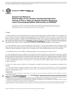 ASTM D8024-23 is a standard published by ASTM International. Its full title is "Standard Test Method for Determination of (Tri-n-butyl)-n-tetradecylphosphonium chloride (TTPC) in Water by Multiple Reaction Monitoring Liquid Chromatography/Mass Spectrometry (LC/MS/MS)". This standard covers: SIGNIFICANCE AND USE 5.1 TTPC may be used in various industrial and commercial products for use as a biocide. Products containing TTPC have been approved for controlling algal, bacterial, and fungal slimes in industrial water systems.2 TTPC should not be persistent in water but may be deposited in sediments at concentrations of concern. Hence, there is a need for quick, easy and robust method to determine TTPC concentration at trace levels in water matrices for understanding the sources and concentration levels in affected areas. 5.2 This method has been used to determine TTPC in reagent water and a river water (Table 8). (A) Solution A: Level 8 stock solution prepared according to Section 12 and at Table 4 concentrations.(B) Solution B: 75 % Acetone, 25 % Water. Note 1: This test method has been used to characterize TTPC in real world water samples with success and similar recoveries as shown in Table 8. SCOPE 1.1 This test method covers the determination of (Tri-n-butyl)-n-tetradecylphosphonium chloride (TTPC) in water by dilution with acetone, filtration and analysis by liquid chromatography/tandem mass spectrometry. This test method is not amenable for the analysis of isomeric mixtures of Tributyl-tetradecylphosphonium chloride. TTPC is a biocide that strongly adsorbs to soils.2 The water samples are prepared in a solution of 75 % acetone and 25 % water because TTPC has an affinity for surfaces and particles. The reporting range for this method is from 100 ng/L to 4000 ng/L. This analyte is qualitatively and quantitatively determined by this method. This test method adheres to multiple reaction monitoring (MRM) mass spectrometry. 1.2 A full collaborative study to meet the requirements of Practice D2777 has not been completed. This test method contains single-operator precision and bias based on single-operator data. Publication of standards that have not been fully validated is done to make the current technology accessible to users of standards, and to solicit additional input from the user community. 1.3 The Method Detection Limit3 (MDL) and Reporting Range4 for the target analyte are listed in Table 1. 1.3.1 The reporting limit in this test method is the minimum value below which data are documented as non-detects. Analyte detections between the method detection limit and the reporting limit are estimated concentrations and are not reported following this test method. The reporting limit is calculated from the concentration of the Level 1 calibration standard as shown in Table 4 for TTPC after taking into account a 2.5 mL water sample volume and a final diluted sample volume of 10 mL (75 % acetone/25 % water). The final solution volume is 10 mL because a 7.5 mL volume of acetone is added to each 2.5 mL water sample which is shaken and filtered. 1.4 Units—The values stated in SI units are to be regarded as standard. No other units of measurement are included in this standard. 1.5 This standard does not purport to address all of the safety concerns, if any, associated with its use. It is the responsibility of the user of this standard to establish appropriate safety, health, and environmental practices and determine the applicability of regulatory limitations prior to use. 1.6 This international standard was developed in accordance with internationally recognized principles on standardization established in the Decision on Principles for the Development of International Standards, Guides and Recommendations issued by the World Trade Organization Technical Barriers to Trade (TBT) Committee.