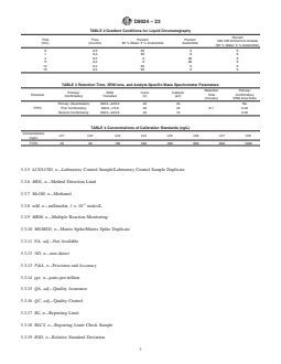 1.3.1 The reporting limit in this test method is the minimum value below which data are documented as non-detects. Analyte detections between the method detection limit and the reporting limit are estimated concentrations and are not reported following this test method. The reporting limit is calculated from the concentration of the Level 1 calibration standard as shown in Table 4 for TTPC after taking into account a 2.5 mL water sample volume and a final diluted sample volume of 10 mL (75 % acetone/25 % water). The final solution volume is 10 mL because a 7.5 mL volume of acetone is added to each 2.5 mL water sample which is shaken and filtered.
