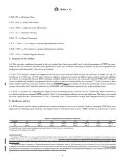 SIGNIFICANCE AND USE 5.1 TTPC may be used in various industrial and commercial products for use as a biocide. Products containing TTPC have been approved for controlling algal, bacterial, and fungal slimes in industrial water systems.2 TTPC should not be persistent in water but may be deposited in sediments at concentrations of concern. Hence, there is a need for quick, easy and robust method to determine TTPC concentration at trace levels in water matrices for understanding the sources and concentration levels in affected areas. 5.2 This method has been used to determine TTPC in reagent water and a river water (Table 8). (A) Solution A: Level 8 stock solution prepared according to Section 12 and at Table 4 concentrations.(B) Solution B: 75 % Acetone, 25 % Water. Note 1: This test method has been used to characterize TTPC in real world water samples with success and similar recoveries as shown in Table 8. SCOPE 1.1 This test method covers the determination of (Tri-n-butyl)-n-tetradecylphosphonium chloride (TTPC) in water by dilution with acetone, filtration and analysis by liquid chromatography/tandem mass spectrometry. This test method is not amenable for the analysis of isomeric mixtures of Tributyl-tetradecylphosphonium chloride. TTPC is a biocide that strongly adsorbs to soils.2 The water samples are prepared in a solution of 75 % acetone and 25 % water because TTPC has an affinity for surfaces and particles. The reporting range for this method is from 100 ng/L to 4000 ng/L. This analyte is qualitatively and quantitatively determined by this method. This test method adheres to multiple reaction monitoring (MRM) mass spectrometry. 1.2 A full collaborative study to meet the requirements of Practice D2777 has not been completed. This test method contains single-operator precision and bias based on single-operator data. Publication of standards that have not been fully validated is done to make the current technology accessible to users of standards, and to solicit additional input from the user community. 1.3 The Method Detection Limit3 (MDL) and Reporting Range4 for the target analyte are listed in Table 1. 1.3.1 The reporting limit in this test method is the minimum value below which data are documented as non-detects. Analyte detections between the method detection limit and the reporting limit are estimated concentrations and are not reported following this test method. The reporting limit is calculated from the concentration of the Level 1 calibration standard as shown in Table 4 for TTPC after taking into account a 2.5 mL water sample volume and a final diluted sample volume of 10 mL (75 % acetone/25 % water). The final solution volume is 10 mL because a 7.5 mL volume of acetone is added to each 2.5 mL water sample which is shaken and filtered. 1.4 Units—The values stated in SI units are to be regarded as standard. No other units of measurement are included in this standard. 1.5 This standard does not purport to address all of the safety concerns, if any, associated with its use. It is the responsibility of the user of this standard to establish appropriate safety, health, and environmental practices and determine the applicability of regulatory limitations prior to use. 1.6 This international standard was developed in accordance with internationally recognized principles on standardization established in the Decision on Principles for the Development of International Standards, Guides and Recommendations issued by the World Trade Organization Technical Barriers to Trade (TBT) Committee.
