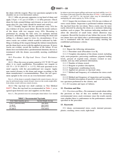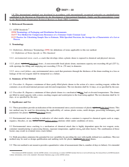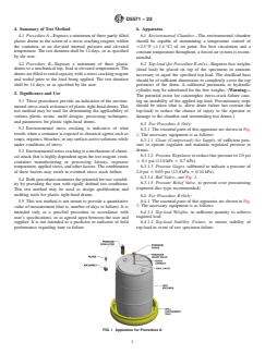 SIGNIFICANCE AND USE 5.1 These procedures provide an indication of the environmental stress-crack resistance of plastic tight-head drums. This test method may be used for determining the applicability of various plastic resins, mold designs, processing techniques, and parameters for plastic tight-head drums. 5.2 Environmental stress cracking is indicative of what results when a container is exposed to chemical agents such as soaps, organics, bleaches, or any surface-active solutions while under conditions of stress. 5.3 Environmental stress cracking is a mechanism of chemical attack that is highly dependent upon the test reagent, resin, container manufacturing or processing history, exposure temperature, applied stress, and other factors. The combination of these factors may result in eventual stress crack failure. 5.4 Both procedures minimize the potential for test variability by providing the user with rigidly defined test conditions. This test method may be used as design qualification and auditing tools for plastic tight-head drums. 5.5 This test method is not meant to provide a quantitative value of measurement (that is, number of days to failure). It is intended only as a pass/fail procedure in accordance with user’s specifications, or as agreed upon between the user and supplier. It is not intended as a predictor or indicator of field performance regarding time to failure. SCOPE 1.1 This test method provides an indication of the environmental stress crack resistance of plastic tight-head drums as a summation of the effects of container design, resin, manufacturing conditions, field performance, and other factors. 1.2 This test method may be used to evaluate a plastic drum's resistance to failure by cracking when in the presence of chemical and physical stresses. 1.3 Two procedures are provided as follows: 1.3.1 Procedure A—Internal pressure stress crack resistance method to nonyl phenoxypoly (ethyleneoxy) ethanol solution, a stress cracking reagent. The internal pressure is controlled at a constant elevated pressure and temperature. 1.3.2 Procedure B—Top-load stress crack resistance method to nonyl phenoxypoly ethanol, a stress cracking reagent. The compressive top-load is controlled at a constant weight while maintaining an elevated temperature. 1.4 Although these procedures are not designed to test the ability of the closure or closure gasket material to retain the test reagent, the inclusion of closure failure as a container failure mode is optional. However, leakage through a closure may affect the internal pressure that could affect the test results. 1.5 This test method does not attempt to address all factors that could lead to stress cracking of plastic drums. The user of this standard may use other test parameters, such as top-loads, chemical reagents, etc., as agreed upon between the user and supplier in the event of a drum qualification or purchase agreement. 1.6 The values stated in inch-pound units are to be regarded as the standard. The SI units given in parentheses are for information only. 1.7 This standard does not purport to address all of the safety concerns, if any, associated with its use. It is the responsibility of the user of this standard to establish appropriate safety, health, and environmental practices and determine the applicability of regulatory limitations prior to use. Specific warning statements are given in 6.2. 1.8 This international standard was developed in accordance with internationally recognized principles on standardization established in the Decision on Principles for the Development of International Standards, Guides and Recommendations issued by the World Trade Organization Technical Barriers to Trade (TBT) Committee.