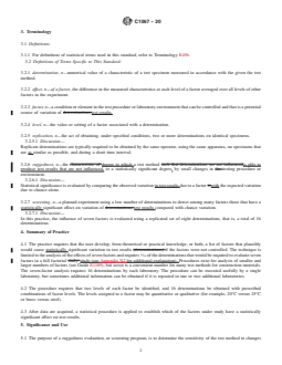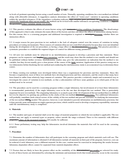 SIGNIFICANCE AND USE 5.1 The purpose of a ruggedness evaluation, or screening program, is to determine the sensitivity of the test method to changes in levels of pertinent operating factors using a small number of tests. Normally, operating conditions for a test method are defined along with allowable tolerances. A ruggedness analysis determines the effect of “worst-case” variation in operating conditions within the specified tolerances. If the ruggedness evaluation indicates that the factors have a statistically significant effect on test results, the method can be revised with smaller tolerances on operating conditions to reduce variation among test results. 5.2 This practice evaluates the effects of seven factors using eight testing conditions (treatments). The disadvantage of this approach is that it only estimates the main effects of the factors and does not detect the effects of interactions among factors. For this reason, this is a screening program and additional investigation is required to determine whether there are interaction effects. 5.3 A major reason for poor precision in test methods is the lack of adequate control over the sources of variation in testing procedures or testing environments. These sources of variation often are not controlled adequately because they were not identified during the development of the test procedures as having a large effect on test results. This practice provides a systematic procedure to establish the required degree of control for different testing parameters. 5.4 All new test methods must be subjected to an interlaboratory program to develop a precision and bias statement. These programs can be expensive and time-consuming, and the result may show that the method is too variable and should not be published without further revision. Interlaboratory studies may give the subcommittee an indication that the method is too variable, but they do not usually give a clear picture of the causes of the high variation. Application of this ... SCOPE 1.1 This practice covers a procedure for evaluating the ruggedness of a test method by determining the effects of different experimental factors on the variation of test results. The procedure is intended for use during the development of a test method before the interlaboratory study is executed, such as those described in Practices C802 and E691. 1.2 This practice covers, in general terms, techniques for planning, collecting data, and analyzing results from a few laboratories. Appendix X1 provides the details of the procedure with an example and Appendix X2 provides additional information on the methodology. 1.3 The practice is not intended to give information pertinent to estimating multilaboratory precision. 1.4 The system of units for this practice is not specified. Dimensional quantities in the practice are presented only in illustrations of calculation methods. 1.5 This standard does not purport to address all of the safety concerns, if any, associated with its use. It is the responsibility of the user of this standard to establish appropriate safety, health, and environmental practices and determine the applicability of regulatory limitations prior to use. 1.6 This international standard was developed in accordance with internationally recognized principles on standardization established in the Decision on Principles for the Development of International Standards, Guides and Recommendations issued by the World Trade Organization Technical Barriers to Trade (TBT) Committee.