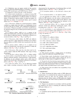 SIGNIFICANCE AND USE 4.1 This practice provides a simple means of classifying failure modes for adhesively bonded FRP joints. 4.2 Each failure mode classification is based solely on a visual observation of the failure surface without the aid of a microscope or other means to magnify the surface. 4.3 Except for the line-drawing representations given, this practice does not contain descriptions of failure modes possible when using adhesion promoters. However, similar analogies to the failure modes described herein can be made. 4.4 This practice does not address the acceptability of any specific failure mode. SCOPE 1.1 This practice covers the method of classifying, identifying, and characterizing the failure modes in adhesively bonded fiber-reinforced-plastic (FRP) joints. The FRP used in developing this practice consists of glass fibers in a thermoset-polyester-resin matrix, commonly referred to as sheet-molding compound, or SMC. 1.2 One objective of this practice is to present comprehensive definitions of possible failure modes to serve as a guide for contracts, drawings, product specifications, and product performance. Note 1: Figures 2 through 11 referred to in the practice are contained in the ASTM adjunct, Color Photographs of Failure Modes.2 Fig. 2—Side-by Side Comparison of Failure Modes Fig. 3—Adhesive Failure Fig. 4—Cohesive Failure Fig. 5—Thin-Layer Cohesive Failure Fig. 6—Fiber-Tear Failure Fig. 7—Light-Fiber-Tear Failure Fig. 8—Stock-Break Failure Fig. 9—Mixed Failure—40 % Fiber-Tear Failure, 60 % Light-Fiber-Tear Fiber Fig. 10—Mixed Failure—32 % Adhesive Failure, 68 % Fiber-Tear Failure Fig. 11—Mixed Failure—20 % Adhesive Failure, 60 % Light-Fiber-Tear Failure, 20 % Fiber-Tear Failure Note 2: This practice may be used to describe the failure modes generated from testing, using procedures such as Test Methods D3163, D3164, D3165, D3807, D5041, D5868, and SAE J1525. 1.3 The values stated in SI units are to be regarded as the standard. 1.4 This standard does not purport to address all of the safety concerns, if any, associated with its use. It is the responsibility of the user of this standard to establish appropriate safety, health, and environmental practices and determine the applicability of regulatory limitations prior to use. 1.5 This international standard was developed in accordance with internationally recognized principles on standardization established in the Decision on Principles for the Development of International Standards, Guides and Recommendations issued by the World Trade Organization Technical Barriers to Trade (TBT) Committee.