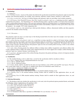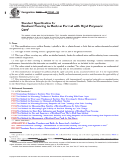 ABSTRACT This specification establishes the material, manufacturing, physical, and performance requirements for resilient flooring, typically in tiles or planks format, or both, that are surface decorated or printed and protected by a clear wear layer. The product is a laminated resilient flooring structure that utilizes a polymeric rigid core as part of the product structure and is intended for use in commercial and residential buildings. This type of floor covering may also be manufactured with or without an attached underlay backer for better noise reduction and to help with accommodating minor subfloor irregularities. The wear surface of the resilient tile(s) or plank(s) shall be composed of binder, filler, and pigments compounded with suitable lubricants and processing aids. The binder consists of one or more polymers or copolymers of vinyl chloride, other modifying resins, plasticizers, and stabilizers. The polymers or copolymers of vinyl chloride comprise at least 60% of the weight of the binder. Any copolymer of vinyl chloride used shall contain at least 85% vinyl chloride. Physical requirements cover binder content, size, thickness, squareness, flatness, openings, and ledging, whereas performance requirements cover residual indentation, surface integrity test, dimensional stability, resistance to chemicals, resistance to heat, resistance to light, and static load resistance. This specification also covers sampling for tests, conditioning, inspection, and certification, as well as workmanship, finish, and appearance, and packaging, packing, and marking. SCOPE 1.1 This specification covers resilient flooring, typically in tiles or planks format, or both, that are surface decorated or printed and protected by a clear wear layer. 1.2 This type of floor covering utilizes a polymeric rigid core as part of the product structure. 1.3 This type of floor covering may utilize an attached underlay backer for reduced noise and for reducing issues concerning minor subfloor irregularities. 1.4 This type of floor covering is intended for use in commercial and residential buildings. General information and performance characteristics that determine serviceability and recommended use are included in this specification. 1.5 The values stated in inch-pound units are to be regarded as standard. The values given in parentheses are mathematical conversions to SI units that are provided for information only and are not considered standard. 1.6 This standard does not purport to address all of the safety concerns, if any, associated with its use. It is the responsibility of the user of this standard to establish appropriate safety, health, and environmental practices and determine the applicability of regulatory limitations prior to use. 1.7 This international standard was developed in accordance with internationally recognized principles on standardization established in the Decision on Principles for the Development of International Standards, Guides and Recommendations issued by the World Trade Organization Technical Barriers to Trade (TBT) Committee.