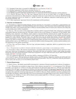 Physical requirements cover binder content, size, thickness, squareness, flatness, openings, and ledging, whereas performance requirements cover residual indentation, surface integrity test, dimensional stability, resistance to chemicals, resistance to heat, resistance to light, and static load resistance. This specification also covers sampling for tests, conditioning, inspection, and certification, as well as workmanship, finish, and appearance, and packaging, packing, and marking.
