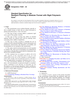 ASTM F3261-20 is a technical specification published by ASTM International. Its full title is "Standard Specification for Resilient Flooring in Modular Format with Rigid Polymeric Core". This standard covers: ABSTRACT This specification establishes the material, manufacturing, physical, and performance requirements for resilient flooring, typically in tiles or planks format, or both, that are surface decorated or printed and protected by a clear wear layer. The product is a laminated resilient flooring structure that utilizes a polymeric rigid core as part of the product structure and is intended for use in commercial and residential buildings. This type of floor covering may also be manufactured with or without an attached underlay backer for better noise reduction and to help with accommodating minor subfloor irregularities. The wear surface of the resilient tile(s) or plank(s) shall be composed of binder, filler, and pigments compounded with suitable lubricants and processing aids. The binder consists of one or more polymers or copolymers of vinyl chloride, other modifying resins, plasticizers, and stabilizers. The polymers or copolymers of vinyl chloride comprise at least 60% of the weight of the binder. Any copolymer of vinyl chloride used shall contain at least 85% vinyl chloride. Physical requirements cover binder content, size, thickness, squareness, flatness, openings, and ledging, whereas performance requirements cover residual indentation, surface integrity test, dimensional stability, resistance to chemicals, resistance to heat, resistance to light, and static load resistance. This specification also covers sampling for tests, conditioning, inspection, and certification, as well as workmanship, finish, and appearance, and packaging, packing, and marking. SCOPE 1.1 This specification covers resilient flooring, typically in tiles or planks format, or both, that are surface decorated or printed and protected by a clear wear layer. 1.2 This type of floor covering utilizes a polymeric rigid core as part of the product structure. 1.3 This type of floor covering may utilize an attached underlay backer for reduced noise and for reducing issues concerning minor subfloor irregularities. 1.4 This type of floor covering is intended for use in commercial and residential buildings. General information and performance characteristics that determine serviceability and recommended use are included in this specification. 1.5 The values stated in inch-pound units are to be regarded as standard. The values given in parentheses are mathematical conversions to SI units that are provided for information only and are not considered standard. 1.6 This standard does not purport to address all of the safety concerns, if any, associated with its use. It is the responsibility of the user of this standard to establish appropriate safety, health, and environmental practices and determine the applicability of regulatory limitations prior to use. 1.7 This international standard was developed in accordance with internationally recognized principles on standardization established in the Decision on Principles for the Development of International Standards, Guides and Recommendations issued by the World Trade Organization Technical Barriers to Trade (TBT) Committee.