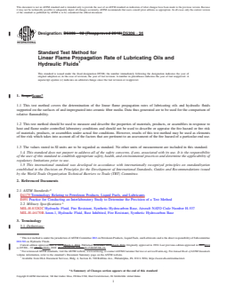SIGNIFICANCE AND USE 5.1 The linear flame propagation rate of a sample is a property that is relevant to the overall assessment of the flammability or relative ignitability of fire resistance lubricants and hydraulic fluids. It is intended to be used as a bench-scale test for distinguishing between the relative resistance to ignition of such materials. It is not intended to be used for the evaluation of the relative flammability of flammable, extremely flammable, or volatile fuels, solvents, or chemicals. SCOPE 1.1 This test method covers the determination of the linear flame propagation rates of lubricating oils and hydraulic fluids supported on the surfaces of and impregnated into ceramic fiber media. Data thus generated are to be used for the comparison of relative flammability. 1.2 This test method should be used to measure and describe the properties of materials, products, or assemblies in response to heat and flame under controlled laboratory conditions and should not be used to describe or appraise the fire hazard or fire risk of materials, products, or assemblies under actual fire conditions. However, results of this test method may be used as elements of fire risk which takes into account all of the factors that are pertinent to an assessment of the fire hazard of a particular end use. 1.3 The values stated in SI units are to be regarded as standard. No other units of measurement are included in this standard. 1.4 This standard does not purport to address all of the safety concerns, if any, associated with its use. It is the responsibility of the user of this standard to establish appropriate safety, health, and environmental practices and determine the applicability of regulatory limitations prior to use. 1.5 This international standard was developed in accordance with internationally recognized principles on standardization established in the Decision on Principles for the Development of International Standards, Guides and Recommendations issued by the World Trade Organization Technical Barriers to Trade (TBT) Committee.