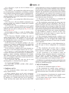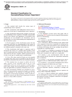 SIGNIFICANCE AND USE 4.1 This classification defines various types of cannabis extract vaporizer devices. 4.2 Extract vaporizer devices can be used to incorporate extracts intended for inhalation from any type of cannabis plant. There is no distinction between those extracts intended for inhalation of a cannabis plant that can be classified as “hemp” and those that cannot, other than the delta-9-THC content. Both forms of extracts are intended to be incorporated into the body by means of direct inhalation of the vapors that result from either combustion or vaporization of the substance. Therefore, the classification system presented in this standard shall be applicable to any vaporizer device intended to be used to facilitate the vaporization of an extract of a cannabis plant intended for inhalation regardless of the type of cannabis plant from which the extract was derived. 4.3 The purpose of this classification is to standardize the naming of device types under the classification. 4.4 The classification system breaks the device types into three main categories and two subcategories. These are intended to aid buyers and sellers of these devices in accurately defining the products they are buying or selling. This classification system shall also aid in the understanding of the various types of extract vaporizing devices that exist in the marketplace by reducing them down to their most common denominator: are they handheld or desktop or universal, do they come prefilled or not, and do they connect to a power source by means of threads or a magnet or otherwise. 4.5 This classification standard provides a uniform set of usage definitions within the cannabis industry. Included within this classification is a set of figures that outlines some individual components and aspects of various types of cannabis extract vaporizers. 4.6 This classification helps to clarify differentiations between the types of device configurations for consumption usage. 4.7 This classification will... SCOPE 1.1 This standard shall classify the various types of cannabis/hemp extract vaporizers. 1.2 This classification shall differentiate between the intended use of each type of cannabis/hemp extract vaporizers. 1.3 This classification shall provide examples of each type of cannabis/hemp extract vaporizers. Examples and pictorials shown in the Annexes and Appendixes or described in this classification are not intended to be all-inclusive and are included only as an aid in understanding and comprehension of the classification system. 1.4 For the purposes of this classification system, the term concentrate and extract are interchangeable in the context of source material being consumed. Concentrate and extract are two different products consumed in the same way 1.5 This classification shall apply to vaporizers used to incorporate the extracts of a cannabis plant regardless of the type of cannabis plant from which they where derived. For the sake of brevity, the term “cannabis” shall be used from now on to refer to any type of cannabis plant (cannabis/hemp). 1.6 Units—The values stated in SI units are to be regarded as standard. The values given in parentheses after SI units are provided for information only and are not considered standard. 1.7 This standard does not purport to address all of the safety concerns, if any, associated with its use. It is the responsibility of the user of this standard to establish appropriate safety, health, and environmental practices and determine the applicability of regulatory limitations prior to use. 1.8 This international standard was developed in accordance with internationally recognized principles on standardization established in the Decision on Principles for the Development of International Standards, Guides and Recommendations issued by the World Trade Organization Technical Barriers to Trade (TBT) Committee.