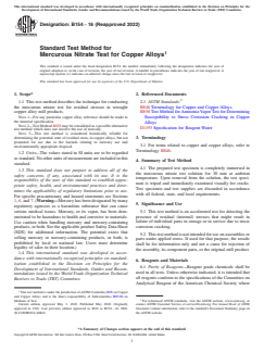 ASTM B154-16(2022) is a standard published by ASTM International. Its full title is "Standard Test Method for Mercurous Nitrate Test for Copper Alloys". This standard covers: SIGNIFICANCE AND USE 5.1 This test method is an accelerated test for detecting the presence of residual (internal) stresses that might result in failure of individual parts in storage or in service due to stress corrosion cracking. 5.2 This test method is not intended for use on assemblies or parts under applied stress. If used for that purpose, the results shall be for information only and not a cause for rejection of the assembly, its component parts, or the original mill product. SCOPE 1.1 This test method describes the technique for conducting the mercurous nitrate test for residual stresses in wrought copper alloy mill products. Note 1: For any particular copper alloy, reference should be made to the material specification. Note 2: Test Method B858 may be considered as a possible alternative test method which does not involve the use of mercury. Note 3: This test method is considered historically reliable for determining the potential state of residual stress in copper alloys, but not promoted for use due to the hazards relating to mercury use and environmentally appropriate disposal. 1.2 Units—The values stated in SI units are to be regarded as standard. No other units of measurement are included in this standard. 1.3 This standard does not purport to address all of the safety concerns, if any, associated with its use. It is the responsibility of the user of this standard to establish appropriate safety, health, and environmental practices and determines the applicability of regulatory limitations prior to use. For specific precautionary and hazard statements see Sections 1, 6, and 7. (Warning—Mercury has been designated by many regulatory agencies as a hazardous substance that can cause serious medical issues. Mercury, or its vapor, has been demonstrated to be hazardous to health and corrosive to materials. Use caution when handling mercury and mercury-containing products, or both. See the applicable product Safety Data Sheet (SDS) for additional information. The potential exists that selling mercury or mercury-containing products, or both, is prohibited by local or national law. Users must determine legality of sales in their location.) 1.4 This international standard was developed in accordance with internationally recognized principles on standardization established in the Decision on Principles for the Development of International Standards, Guides and Recommendations issued by the World Trade Organization Technical Barriers to Trade (TBT) Committee.