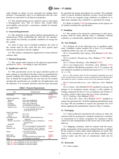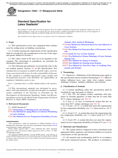 ASTM C834-17(2023) is a technical specification published by ASTM International. Its full title is "Standard Specification for Latex Sealants". This standard covers: ABSTRACT This specification covers latex sealants used for sealing joints in building construction. The following are the type and grade of sealant under this specification: Type OP, Type C, Grade -18°C, Grade 0°C, and Grade NF. The sealant shall be composed of latex formulated with appropriate fillers, pigments, and chemical additives. The physical properties of the sealant shall conform to the specified requirements according to type and grade. The following tests shall be done: extrudability after aging, artificial weathering, volume shrinkage, low-temperature flexibility, extension-recovery and adhesion, slump, staining, and tack-free time. SIGNIFICANCE AND USE 8.1 This specification covers two types and three grades of latex sealants as described in Section 4 that are formulated for general caulking and sealing operations in building construction. It should be recognized by the user that not all sealants meeting this specification are suitable for all applications and all substrates. It is essential, therefore, that the type and grade be specified for proper description of a sealant. Test methods relate to special standard substrates of glass, wood and aluminum. If tests are required using substrates in addition to or other than standard, they should be so specified for testing. 8.2 Refer to Guide C1193 for information on the proper use of sealants meeting this specification. SCOPE 1.1 This specification covers one component latex sealants used for sealing joints in building construction. 1.2 A sealant meeting the requirements of this specification shall be classified by the manufacturer to be one of the types and grades defined in Section 4. 1.3 The values stated in SI units are to be regarded as the standard. The inch-pound in parenthesis are provided for information purposes only. 1.4 The following precautionary caveat pertains only to the test method portion, Section 10, of this Specification: This standard does not purport to address all of the safety concerns, if any, associated with its use. It is the responsibility of the user of this standard to establish appropriate safety, health, and environmental practices and determine the applicability of regulatory limitations prior to use. Note 1: Currently, there is no ISO standard similar to this specification. 1.5 This international standard was developed in accordance with internationally recognized principles on standardization established in the Decision on Principles for the Development of International Standards, Guides and Recommendations issued by the World Trade Organization Technical Barriers to Trade (TBT) Committee.