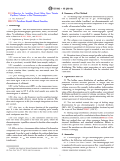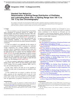 SIGNIFICANCE AND USE 5.1 The boiling range distribution of medium and heavy petroleum distillate fractions provides an insight into the composition of feed stocks and products related to petroleum refining processes (for example, hydrocracking, hydrotreating, visbreaking, or deasphalting). The gas chromatographic simulation of this determination can be used to replace conventional distillation methods for control of refining operations. This test method can be used for product specification testing with the mutual agreement of interested parties. 5.2 This test method extends the scope of boiling range determination by gas chromatography to include distillates (IBP > 100 °C) and heavy petroleum distillate fractions beyond the scope of Test Method D2887 (538 °C). 5.3 Boiling range distributions obtained by this test method have not been analyzed for correlation to those obtained by low efficiency distillation, such as with Test Method D86 or D1160. This test method does not claim agreement between these physical distillations and simulated distillation. Efforts to resolve this question will continue. When successful resolutions of the questions are determined, this test method will be revised accordingly. SCOPE 1.1 This test method covers the determination of the boiling range distribution of petroleum products by capillary gas chromatography using flame ionization detection. This standard test method has been developed through the harmonization of two test methods, Test Method D6352 and IP 480. As both of these methods cover the same scope and include very similar operating conditions, it was agreed that a single standard method would benefit the global simulated distillation community. 1.2 This test method is not applicable for the analysis of petroleum or petroleum products containing low molecular weight components (for example naphthas, reformates, gasolines, diesel). Components containing hetero atoms (for example alcohols, ethers, acids, or esters) or residue are not to be analyzed by this test method. See Test Methods D7096, D2887, or D7213 for possible applicability to analysis of these types of materials. This method is also not suitable for samples that will not elute completely from the gas chromatographic column, leaving residues. For such samples as crude oils and residues, see Test Methods D5307 and D7169. 1.3 This test method is applicable to distillates with initial boiling points above 100 ºC and final boiling points below 735 ºC (carbon 110); for example, distillates (IBP > 100 °C), base oils and lubricating base stocks. 1.4 The values stated in SI units are to be regarded as standard. No other units of measurement are included in this standard. 1.5 This standard does not purport to address all of the safety concerns, if any, associated with its use. It is the responsibility of the user of this standard to establish appropriate safety, health, and environmental practices and determine the applicability of regulatory limitations prior to use. 1.6 This international standard was developed in accordance with internationally recognized principles on standardization established in the Decision on Principles for the Development of International Standards, Guides and Recommendations issued by the World Trade Organization Technical Barriers to Trade (TBT) Committee.