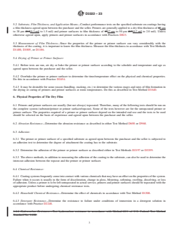 ASTM D3322-23 is a standard published by ASTM International. Its full title is "Standard Practice for Testing Primers and Primer Surfacers Over Preformed Metal". This standard covers: SIGNIFICANCE AND USE 4.1 Primers and primer surfacers may be used over many different surfaces top coated with one or more of a variety of coatings and subjected to many kinds of wear and exposure. 4.2 The selection of the tests to be used for any given product or system must be governed by experience and by the requirement agreed upon between the producer and the user. SCOPE 1.1 This practice covers the selection and use of procedures for testing primers and primer surfacers. 1.2 The values stated in SI units are to be regarded as the standard. The values given in parentheses are for information only. 1.3 This standard does not purport to address all of the safety concerns, if any, associated with its use. It is the responsibility of the user of this standard to establish appropriate safety, health, and environmental practices and determine the applicability of regulatory limitations prior to use. 1.4 This international standard was developed in accordance with internationally recognized principles on standardization established in the Decision on Principles for the Development of International Standards, Guides and Recommendations issued by the World Trade Organization Technical Barriers to Trade (TBT) Committee.