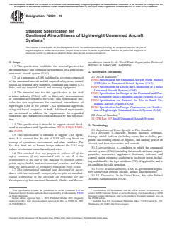 ASTM F2909-19 is a technical specification published by ASTM International. Its full title is "Standard Specification for Continued Airworthiness of Lightweight Unmanned Aircraft Systems". This standard covers: SCOPE 1.1 This specification establishes the standard practice for the maintenance and continued airworthiness of a lightweight unmanned aircraft system (UAS). 1.2 At a minimum, a UAS is defined as a system composed of the unmanned aircraft and all required subsystems, control station, all required crew members, command and control (C2) links, and any required launch and recovery equipment. 1.3 The intended use for this specification is for civil aviation authority (CAA), self-, or third-party determinations of continued airworthiness for UAS. This specification provides the core requirements for continued airworthiness of lightweight UAS or for certain CAA operational approvals using risk-based categories, or both. Additional requirements are envisioned to address the requirements for expanded operations and characteristics not addressed by this specification. 1.4 This specification is intended to support aircraft developed in accordance with Specifications F2910, F3002, F3005, and F3298. 1.5 This specification is intended to support UAS operations. It is assumed that the risk of UAS will vary based on concept of operations, environment, and other variables. The fact that there are no human beings onboard the UAS may reduce or eliminate some hazards and risks. 1.6 This standard does not purport to address all of the safety concerns, if any, associated with its use. It is the responsibility of the user of this standard to establish appropriate safety, health, and environmental practices and determine the applicability of regulatory limitations prior to use. 1.7 This international standard was developed in accordance with internationally recognized principles on standardization established in the Decision on Principles for the Development of International Standards, Guides and Recommendations issued by the World Trade Organization Technical Barriers to Trade (TBT) Committee.