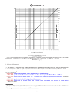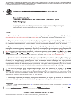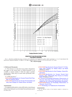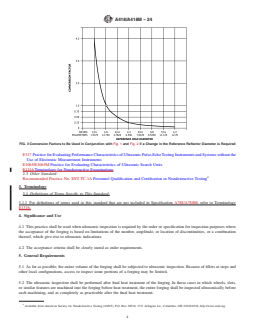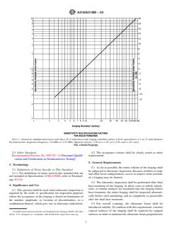 SIGNIFICANCE AND USE 4.1 This practice shall be used when ultrasonic inspection is required by the order or specification for inspection purposes where the acceptance of the forging is based on limitations of the number, amplitude, or location of discontinuities, or a combination thereof, which give rise to ultrasonic indications. 4.2 The acceptance criteria shall be clearly stated as order requirements. SCOPE 1.1 This practice for ultrasonic examination covers turbine and generator steel rotor forgings covered by Specifications A469/A469M, A470/A470M, A768/A768M, and A940/A940M. This practice shall be used for contact testing only. 1.2 This practice describes a basic procedure of ultrasonically inspecting turbine and generator rotor forgings. It does not restrict the use of other ultrasonic methods such as reference block calibrations when required by the applicable procurement documents nor is it intended to restrict the use of new and improved ultrasonic test equipment and methods as they are developed. 1.3 This practice is intended to provide a means of inspecting cylindrical forgings so that the inspection sensitivity at the forging center line or bore surface is constant, independent of the forging or bore diameter. To this end, inspection sensitivity multiplication factors have been computed from theoretical analysis, with experimental verification. These are plotted in Fig. 1 (bored rotors) and Fig. 2 (solid rotors), for a true inspection frequency of 2.25 MHz, and an acoustic velocity of 2.30 in./s × 105 in./s [5.85 cm/s × 105 cm/s]. Means of converting to other sensitivity levels are provided in Fig. 3. (Sensitivity multiplication factors for other frequencies may be derived in accordance with X1.1 and X1.2 of Appendix X1.) FIG. 1 Bored Forgings Note 1: Sensitivity multiplication factor such that a 10 % indication at the forging bore surface will be equivalent to a 1/8 in. [3 mm] diameter flat bottom hole. Inspection frequency: 2.0 MHz or 2.25 MHz. Material velocity: 2.30 in./s × 105 in./s [5.85 cm/s × 105 cm/s]. FIG. 2 Solid Forgings Note 1: Sensitivity multiplication factor such that a 10 % indication at the forging centerline surface will be equivalent to a 1/8 in. [3 mm] diameter flat bottom hole. Inspection frequency: 2.0 MHz or 2.25 MHz. Material velocity: 2.30 in./s × 105 in./s [5.85 cm/s × 105 cm/s]. FIG. 3 Conversion Factors to Be Used in Conjunction with Fig. 1 and Fig. 2 if a Change in the Reference Reflector Diameter is Required 1.4 Considerable verification data for this method have been generated which indicate that even under controlled conditions very significant uncertainties may exist in estimating natural discontinuities in terms of minimum equivalent size flat-bottom holes. The possibility exists that the estimated minimum areas of natural discontinuities in terms of minimum areas of the comparison flat-bottom holes may differ by 20 dB (factor of 10) in terms of actual areas of natural discontinuities. This magnitude of inaccuracy does not apply to all results but should be recognized as a possibility. Rigid control of the actual frequency used, the coil bandpass width if tuned instruments are used, and so forth, tend to reduce the overall inaccuracy which is apt to develop. 1.5 This practice for inspection applies to solid cylindrical forgings having outer diameters of not less than 2.5 in. [64 mm] nor greater than 100 in. [2540 mm]. It also applies to cylindrical forgings with concentric cylindrical bores having wall thicknesses of 2.5 [64 mm] in. or greater, within the same outer diameter limits as for solid cylinders. For solid sections less than 15 in. [380 mm] in diameter and for bored cylinders of less than 7.5 in. [190 mm] wall thickness the transducer used for the inspection will be different than the transducer used for larger sections. 1.6 Supplementary requirements of an optional nature are provided for use at the option of the...