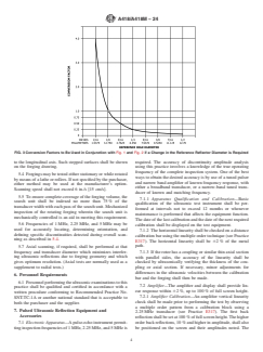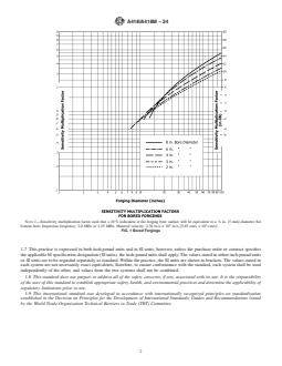 1.3 This practice is intended to provide a means of inspecting cylindrical forgings so that the inspection sensitivity at the forging center line or bore surface is constant, independent of the forging or bore diameter. To this end, inspection sensitivity multiplication factors have been computed from theoretical analysis, with experimental verification. These are plotted in Fig. 1 (bored rotors) and Fig. 2 (solid rotors), for a true inspection frequency of 2.25 MHz, and an acoustic velocity of 2.30 in./s × 105 in./s [5.85 cm/s × 105 cm/s]. Means of converting to other sensitivity levels are provided in Fig. 3. (Sensitivity multiplication factors for other frequencies may be derived in accordance with X1.1 and X1.2 of Appendix X1.)