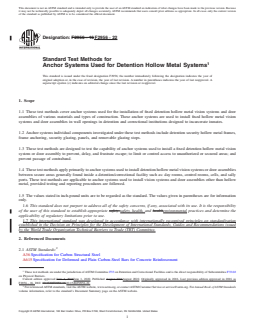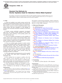 ASTM F2956-22 is a standard published by ASTM International. Its full title is "Standard Test Methods for Anchor Systems Used for Detention Hollow Metal Systems". This standard covers: SIGNIFICANCE AND USE 4.1 A major concern for corrections administration officials is the resistance of security barriers used in detention/correctional facilities to certain types of physical attack that it is reasonable to expect in the field. These test methods are designed to aid in identifying a level of physical security for anchor systems used to install fixed detention hollow metal vision systems and door assemblies. 4.2 These test methods are not intended to measure resistance to attack by corrosive agents, high-powered rifles, explosives, sawing, or other such methods. These test methods are intended to evaluate the resistance of a vision system to violent attacks using battering devices such as benches, bunks, fire extinguishers, or tables; hand guns up to and including the .44 magnum; and fires started by using mattresses, books, and similar flammable materials. 4.3 The primary purpose or result of this standard is to provide detailed test methods that approximate the levels of abuse to which it is possible that vision system and door assembly anchor systems become subjected in the field. The desired result of its use is to give ensurance of protection to the public, to prison administrative personnel, and to the inmates themselves in the event of such attack. Note 1: It is recommended that detention/correctional facility administration provide adequate training, supervision, and preventive maintenance programs to enable hollow metal vision systems to function as intended throughout the expected service life. SCOPE 1.1 These test methods cover anchor systems used for the installation of fixed detention hollow metal vision systems and door assemblies of various materials and types of construction. These anchor systems are used to install fixed hollow metal vision systems and door assemblies in wall openings in detention and correctional institutions designed to incarcerate inmates. 1.2 Anchor systems individual components investigated under these test methods include detention security hollow metal frames, frame anchoring, security glazing, panels, and removable glazing stops. 1.3 These test methods are designed to test the capability of anchor systems used to install a fixed detention hollow metal vision system or door assembly to prevent, delay, and frustrate escape; to limit or control access to unauthorized or secured areas; and prevent passage of contraband. 1.4 These test methods apply primarily to anchor systems used to install detention hollow metal vision systems or door assemblies between secure areas generally found inside a detention/correctional facility such as: day rooms, control rooms, cells, and sally ports. These test methods are applicable to anchor systems used to install vision systems and door assemblies other than hollow metal, provided testing and reporting procedures are followed. 1.5 The values stated in inch-pound units are to be regarded as the standard. The values given in parentheses are for information only. 1.6 This standard does not purport to address all of the safety concerns, if any, associated with its use. It is the responsibility of the user of this standard to establish appropriate safety, health, and environmental practices and determine the applicability of regulatory limitations prior to use. 1.7 This international standard was developed in accordance with internationally recognized principles on standardization established in the Decision on Principles for the Development of International Standards, Guides and Recommendations issued by the World Trade Organization Technical Barriers to Trade (TBT) Committee.