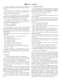 SIGNIFICANCE AND USE 5.1 The purpose of this practice is to outline a procedure for using GWT to locate areas in metal pipes in which wall loss has occurred due to corrosion or erosion. 5.2 GWT does not provide a direct measurement of wall thickness, but is sensitive to a combination of the CSC and circumferential extent and axial extent of any metal loss. Based on this information, a classification of the severity can be assigned. 5.3 The GWT method provides a screening tool to quickly identify any discontinuity along the pipe. Where a possible defect is found, follow-up inspection of suspected areas with ultrasonic testing or other NDT methods is normally required to obtain detailed thickness information, nature, and extent of damage. 5.4 GWT also provides some information on the axial length of a discontinuity, provided that the axial length is longer than roughly a quarter of the wavelength of the excitation signal. 5.5 The identification and severity assessment of any possible defects is qualitative only. An interpretation process to differentiate between relevant and non-relevant signals is necessary. 5.6 This practice only covers the application specified in the scope. The GWT method has the capability and can be used for applications where the pipe is insulated, buried, in road crossings, and where access is limited. 5.7 GWT shall be performed by qualified and certified personnel, as specified in the contract or purchase order. Qualifications shall include training specific to the use of the equipment employed, interpretation of the test results and guided wave technology. 5.8 A documented program that includes training, examination and experience for the GWT personnel certification shall be maintained by the supplying party. SCOPE 1.1 This practice provides a procedure for the use of guided wave testing (GWT), also previously known as long range ultrasonic testing (LRUT) or guided wave ultrasonic testing (GWUT). 1.2 GWT utilizes ultrasonic guided waves, sent in the axial direction of the pipe, to non-destructively test pipes for defects or other features by detecting changes in the cross-section or stiffness of the pipe, or both. 1.3 GWT is a screening tool. The method does not provide a direct measurement of wall thickness or the exact dimensions of defects/defected area; an estimate of the defect severity however can be provided. 1.4 This practice is intended for use with tubular carbon steel or low-alloy steel products having Nominal Pipe size (NPS) 2 to 48 corresponding to 60.3 mm to 1219.2 mm (2.375 in. to 48 in.) outer diameter, and wall thickness between 3.81 mm and 25.4 mm (0.15 in. and 1 in.). 1.5 This practice covers GWT using piezoelectric transduction technology. 1.6 This practice only applies to GWT of basic pipe configuration. This includes pipes that are straight, constructed of a single pipe size and schedules, fully accessible at the test location, jointed by girth welds, supported by simple contact supports and free of internal, or external coatings, or both; the pipe may be insulated or painted. 1.7 This practice provides a general procedure for performing the examination and identifying various aspects of particular importance to ensure valid results, but actual interpretation of the data is excluded. 1.8 This practice does not establish an acceptance criterion. Specific acceptance criteria shall be specified in the contractual agreement by the responsible system user or engineering entity. 1.9 Units—The values stated in SI units are to be regarded as standard. The values given in parentheses are mathematical conversions to SI units that are provided for information only and are not considered standard. 1.10 This standard does not purport to address all of the safety concerns, if any, associated with its use. It is the responsibility of the user of this standard to establish appropriate safety, health, and environmental practices and de...