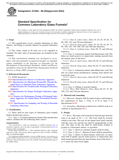 ASTM E1095-99(2022) is a technical specification published by ASTM International. Its full title is "Standard Specification for Common Laboratory Glass Funnels". This standard covers: ABSTRACT This specification covers common laboratory or filter funnels, and filling or powder funnels for general laboratory use. The laboratory glass funnels shall be classified into four types which are divided into classes. Type 1 is common laboratory funnel with smooth inner surface which is divided into three classes: Class A with short stem, Class B with long stem, and Class C without stem. Type 2 is laboratory funnel with fluted inner wall. The flutes are small grooves or depressions running upward from the bottom zone of the bowl. This type is divided into Class A and Class B. Type 3 is laboratory funnel with ribbed inner wall. The ribs are small raised protuberances from funnel rim toward the stem. Class A and Class B funnels belong to this type. Type 4 is the last type which is filling or powder funnels. This type has short, wide diameter stem. SCOPE 1.1 This specification covers common laboratory or filter funnels, and filling or powder funnels for general laboratory use. 1.2 The values stated in SI units are to be regarded as standard. No other units of measurement are included in this standard. 1.3 This international standard was developed in accordance with internationally recognized principles on standardization established in the Decision on Principles for the Development of International Standards, Guides and Recommendations issued by the World Trade Organization Technical Barriers to Trade (TBT) Committee.