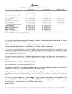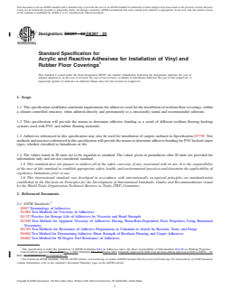 SCOPE 1.1 This specification establishes minimum requirements for adhesives used for the installation of resilient floor coverings, within a climate-controlled structure, when adhered directly and permanently to a structurally sound and recommended substrate. 1.2 This specification will provide the means to determine adhesive bonding as a result of different resilient flooring backing systems used with PVC and rubber flooring materials. 1.3 Adhesives referenced in this specification may also be used for installation of carpets outlined in Specification D7799. Test methods and practices referenced in this specification will provide the means to determine adhesive bonding for PVC backed carpet types, whether classified as broadloom or tile. 1.4 The values stated in SI units are to be regarded as standard. The values given in parentheses after SI units are provided for information only and are not considered standard. 1.5 This standard does not purport to address all of the safety concerns, if any, associated with its use. It is the responsibility of the user of this standard to establish appropriate safety, health, and environmental practices and determine the applicability of regulatory limitations prior to use. 1.6 This international standard was developed in accordance with internationally recognized principles on standardization established in the Decision on Principles for the Development of International Standards, Guides and Recommendations issued by the World Trade Organization Technical Barriers to Trade (TBT) Committee.