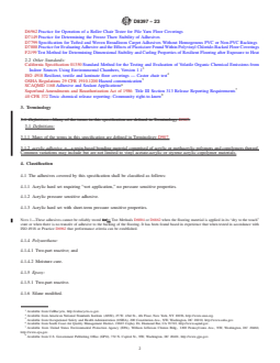 ASTM D8397-23 is a technical specification published by ASTM International. Its full title is "Standard Specification for Acrylic and Reactive Adhesives for Installation of Vinyl and Rubber Floor Coverings". This standard covers: SCOPE 1.1 This specification establishes minimum requirements for adhesives used for the installation of resilient floor coverings, within a climate-controlled structure, when adhered directly and permanently to a structurally sound and recommended substrate. 1.2 This specification will provide the means to determine adhesive bonding as a result of different resilient flooring backing systems used with PVC and rubber flooring materials. 1.3 Adhesives referenced in this specification may also be used for installation of carpets outlined in Specification D7799. Test methods and practices referenced in this specification will provide the means to determine adhesive bonding for PVC backed carpet types, whether classified as broadloom or tile. 1.4 The values stated in SI units are to be regarded as standard. The values given in parentheses after SI units are provided for information only and are not considered standard. 1.5 This standard does not purport to address all of the safety concerns, if any, associated with its use. It is the responsibility of the user of this standard to establish appropriate safety, health, and environmental practices and determine the applicability of regulatory limitations prior to use. 1.6 This international standard was developed in accordance with internationally recognized principles on standardization established in the Decision on Principles for the Development of International Standards, Guides and Recommendations issued by the World Trade Organization Technical Barriers to Trade (TBT) Committee.