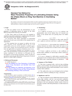 ASTM D3704-96(2017) is a standard published by ASTM International. Its full title is "Standard Test Method for Wear Preventive Properties of Lubricating Greases Using the (Falex) Block on Ring Test Machine in Oscillating Motion". This standard covers: SIGNIFICANCE AND USE 5.1 This test method is used to differentiate between greases having high, medium, and low wear preventive properties using oscillating motion. The user of this method should determine to his own satisfaction whether results of this test procedure correlate with field performance or other bench test machines. SCOPE 1.1 This test method covers the determination of wear properties of lubricating greases by means of the Falex block-on-ring friction and wear test machine. 1.2 The values stated in SI units are to be regarded as standard except where equipment is supplied using inch-pound units and would then be regarded as standard. 1.2.1 Exception—The metric equivalents of inch-pound units given in such cases in the body of the standard may be approximate. 1.3 This standard does not purport to address all of the safety concerns, if any, associated with its use. It is the responsibility of the user of this standard to establish appropriate safety, health, and environmental practices and determine the applicability of regulatory limitations prior to use. 1.4 This international standard was developed in accordance with internationally recognized principles on standardization established in the Decision on Principles for the Development of International Standards, Guides and Recommendations issued by the World Trade Organization Technical Barriers to Trade (TBT) Committee.