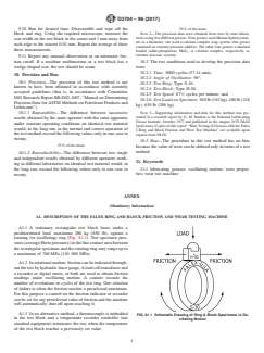 SIGNIFICANCE AND USE 5.1 This test method is used to differentiate between greases having high, medium, and low wear preventive properties using oscillating motion. The user of this method should determine to his own satisfaction whether results of this test procedure correlate with field performance or other bench test machines. SCOPE 1.1 This test method covers the determination of wear properties of lubricating greases by means of the Falex block-on-ring friction and wear test machine. 1.2 The values stated in SI units are to be regarded as standard except where equipment is supplied using inch-pound units and would then be regarded as standard. 1.2.1 Exception—The metric equivalents of inch-pound units given in such cases in the body of the standard may be approximate. 1.3 This standard does not purport to address all of the safety concerns, if any, associated with its use. It is the responsibility of the user of this standard to establish appropriate safety, health, and environmental practices and determine the applicability of regulatory limitations prior to use. 1.4 This international standard was developed in accordance with internationally recognized principles on standardization established in the Decision on Principles for the Development of International Standards, Guides and Recommendations issued by the World Trade Organization Technical Barriers to Trade (TBT) Committee.