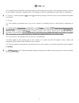 ABSTRACT This practice covers recommended procedures for the handling of orthopedic implants and instruments. Hospital receiving personnel, central supply personnel, operating room personnel, surgeons, and occasionally other individuals will handle orthopedic implants and instruments. All personnel should be informed of recommended care and handling procedures to prevent damage of orthopedic implants and instruments. Many implants are wrapped in special sterilizable or pre-sterilized packages, envelopes, or other containers. These wrappings should not be removed by the receiving personnel. Perform transport in a manner to preclude any damage or alteration to the received condition of the implant or instrument. Store implants or instruments prior to use in such a manner as to maintain the device’s surface finish or configuration, or both. Maintain orthopedic implants and instruments of different metals separately to avoid the possibility of mixing during surgery. Prior to initial sterilization and promptly following each surgical procedure, thoroughly and carefully clean all instruments and implants. Dispose of orthopedic implants that exhibit surface or configuration damage. Avoid the reimplantation of previously implanted orthopedic implants. SCOPE 1.1 This practice covers recommended procedures for the handling of orthopedic implants and instruments. 1.2 Hospital receiving personnel, central supply personnel, operating room personnel, surgeons, and occasionally other individuals will handle orthopedic implants and instruments. All personnel should be informed of recommended care and handling procedures to prevent damage to orthopedic implants and instruments. 1.3 This practice does not cover producer level handling and packaging procedures. 1.4 The values stated in SI units are to be regarded as standard. No other units of measurement are included in this standard. 1.5 This standard does not purport to address all of the safety concerns, if any, associated with its use. It is the responsibility of the user of this standard to establish appropriate safety, health, and environmental practices and determine the applicability of regulatory limitations prior to use. 1.6 This international standard was developed in accordance with internationally recognized principles on standardization established in the Decision on Principles for the Development of International Standards, Guides and Recommendations issued by the World Trade Organization Technical Barriers to Trade (TBT) Committee.