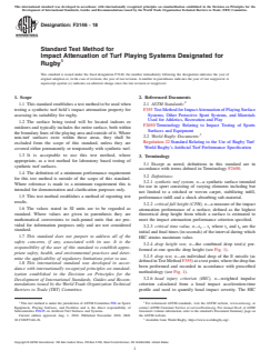 SIGNIFICANCE AND USE 5.1 This test method is to be used to measure the impact attenuation of synthetic turf rugby fields and to estimate the CFH performance. 5.2 It is acceptable for this test method to be specified for use by other organizations, specifiers, or facility owners where it is deemed appropriate. SCOPE 1.1 This standard establishes a test method to be used when testing a synthetic turf field’s impact attenuation property for assessing its suitability for rugby. 1.2 The surface being tested will be located indoors or outdoors and typically includes the entire surface, both within the boundary lines of the playing area and outside of it. Where non-turf surfaces exist within these areas, they shall be excluded from the scope of this standard, unless they are covered either permanently or temporarily with synthetic turf. 1.3 It is acceptable to use this test method, where appropriate, as a test method for laboratory based testing of synthetic turf surfaces. 1.4 The definition of a minimum performance requirement for this test method is outside of the scope of this standard. Where reference is made to a minimum requirement this is intended for demonstration and clarification purposes only. 1.5 This test method establishes a method of reporting test results. 1.6 The values stated in SI units are to be regarded as standard. Where values are given in parenthesis they are mathematical conversions to inch-pound units that are provided for information purposes only and are not considered standard. 1.7 This standard does not purport to address all of the safety concerns, if any, associated with its use. It is the responsibility of the user of this standard to establish appropriate safety, health, and environmental practices and determine the applicability of regulatory limitations prior to use. 1.8 This international standard was developed in accordance with internationally recognized principles on standardization established in the Decision on Principles for the Development of International Standards, Guides and Recommendations issued by the World Trade Organization Technical Barriers to Trade (TBT) Committee.