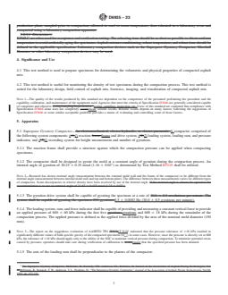 SIGNIFICANCE AND USE 4.1 This test method is used to prepare specimens for determining the volumetric and physical properties of compacted asphalt mix. 4.2 This test method is useful for monitoring the density of test specimens during the compaction process. This test method is suited for the laboratory design, field control of asphalt mix, forensics, imaging, and visualization of compacted asphalt mix. Note 1: The quality of the results produced by this standard are dependent on the competence of the personnel performing the procedure and the capability, calibration, and maintenance of the equipment used. Agencies that meet the criteria of Specification D3666 are generally considered capable of competent and objective testing, sampling, inspection, etc. Users of this standard are cautioned that compliance with Specification D3666 alone does not completely ensure reliable results. Reliable results depend on many factors; following the suggestions of Specification D3666 or some similar acceptable guideline provides a means of evaluating and controlling some of those factors. SCOPE 1.1 This test method covers the compaction of an asphalt mix into cylindrical specimens using the Superpave Gyratory Compactor (SGC). This standard also refers to the determination of the relative density of the compacted specimens at any point in the compaction process. Compacted specimens are suitable for volumetric, physical property, and mechanical testing. Smaller specimens may be cut from the compacted cylindrical specimen for specific test specimen geometry requirements. The compaction procedures apply to Laboratory Mixed Laboratory Compacted (LMLC) and Plant Mixed Laboratory Compacted (PMLC) asphalt mix. 1.2 The values stated in SI units are to be regarded as standard. The values given in degrees for the angle of gyration, gyrations per minute, and hardness are mathematical conversions from the SI units and are provided for information regarding the commonly used units of degree, rotations per minute, and Rockwell hardness, respectfully. 1.3 The text of this test method references notes and footnotes which provide explanatory material. These notes and footnotes (excluding those in tables and figures) shall not be considered as requirements of the standard. 1.4 This standard does not purport to address all of the safety concerns, if any, associated with its use. It is the responsibility of the user of this standard to establish appropriate safety, health, and environmental practices and determine the applicability of regulatory limitations prior to use. 1.5 This international standard was developed in accordance with internationally recognized principles on standardization established in the Decision on Principles for the Development of International Standards, Guides and Recommendations issued by the World Trade Organization Technical Barriers to Trade (TBT) Committee.