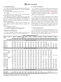 ABSTRACT This specification covers seven tungsten-type (types T1, T2, T4, T5, T6, T8, and T15) and nineteen molybdenum-type high-speed steels (types M1, M2, M3, M4, M6, M7, M10, M30, M33, M34, M36, M41, M42, M43, M44, M46, M47, M48, and M62) in the form of annealed, hot-rolled bars, forgings, plate, sheet, or strip, and annealed, cold-finished bars or forgings used primarily in the fabrication of tools. Two intermediate high speed tool steels designated as M50 and M52 are also covered. Unless otherwise specified, material shall be made by an electric melting process. A chemical analysis of each heat of steel shall be made to determine the percentage of the elements specified (including carbon, manganese, phosphorus, sulfur, silicon, chromium, vanadium, tungsten, molybdenum, and cobalt) and these values shall conform to the requirements as to the prescribed chemical composition. Requirements for: (1) heat treatment such as austenitizing, quenching, and tempering, (2) hardness testing (3) macrostructure and macroetch standard for porosity and ingot pattern, and (4) decarburization determination are detailed. The maximum Brinell hardness and minimum Rockwell C hardness for the tool steels are given. SCOPE 1.1 This specification covers tungsten-type and molybdenum-type high-speed steels available as annealed, hot-rolled bars, forgings, plate, sheet, or strip, and annealed, cold-finished bars or forgings used primarily in the fabrication of tools. 1.2 Seven types of tungsten high-speed tool steels designated T1, T2, etc., seventeen types of molybdenum high-speed tool steels designated M1, M2, etc., and two intermediate high-speed steels designated as M50 and M52 are covered. Selection will depend upon design, service conditions, and mechanical properties. 1.3 The term “high-speed steel” is described and its minimum requirements are covered in the Annex. 1.4 The values stated in inch-pound units are to be regarded as standard. The values given in parentheses are mathematical conversions to SI units that are provided for information only and are not considered standard. 1.5 This international standard was developed in accordance with internationally recognized principles on standardization established in the Decision on Principles for the Development of International Standards, Guides and Recommendations issued by the World Trade Organization Technical Barriers to Trade (TBT) Committee.