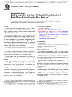 SIGNIFICANCE AND USE 5.1 The shedding of the coating from a vascular stent can alter its clinical safety and/or therapeutic benefit. Clinical performance (for example, drug elution) may be affected by particulate generation from the coated stent system and coating defects. This document provides guidance for coating inspection and acute particulate characterization of drug eluting vascular stents. Information about the potential for shedding can be gained during bench testing. The general guidelines presented here may be used for writing detailed protocols for specific products at the various stages of the product development process. Such testing may be performed during device development, design validation testing, lot-release testing, and/or stability testing although different requirements may apply at each stage. These suggested methods may represent a reasonable simulation of clinical usage. When establishing the coating inspection and acute particulate characterization testing conditions, the current clinical usage/practice (for example, post-dilation, overlapping stents) and the instructions for use (IFU), as applicable, should be considered. While methods for chronic particulate characterization and coating inspection have not been established, these suggested methods may be helpful in the development of chronic methods. Testing in accordance with recommendations in this guide will generate data that may lead to further improvements in the method and its validation, as well as possible advancements in device design and performance. See also FDA Guidance for Industry and FDA Staff and AAMI TIR42:2010. SCOPE 1.1 This guide describes recommended in vitro test procedures for coating inspection and acute particulate characterization of coated drug-eluting vascular (balloon-expandable and self-expanding) stent systems. 1.2 Recommended practices for coating inspection and acute particulate characterization include baseline (deployment) testing and simulated use testing. This guide describes the capture and analysis of particulates. This guide describes the inspection of the coated stent surface. This guide was developed for characterization and not intended for production release testing of coated drug-eluting vascular stent systems although some sections may be appropriate. 1.3 Chronic particulate characterization and coating inspection are not included herein. 1.4 Coating systems specifically designed to degrade or otherwise intentionally separate themselves from the permanent stent structure may not be fully addressed herein. 1.5 The values stated in SI units are to be regarded as standard. No other units of measurement are included in this standard. 1.6 The values stated in inch-pound units are to be regarded as standard. The values given in parentheses are mathematical conversions to SI units that are provided for information only and are not considered standard. 1.7 This international standard was developed in accordance with internationally recognized principles on standardization established in the Decision on Principles for the Development of International Standards, Guides and Recommendations issued by the World Trade Organization Technical Barriers to Trade (TBT) Committee.