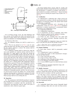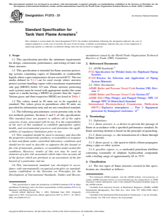 ASTM F1273-21 is a technical specification published by ASTM International. Its full title is "Standard Specification for Tank Vent Flame Arresters". This standard covers: ABSTRACT This specification provides the minimum requirements for design, construction, performance, and testing of two types of tank vent flame arrester (Type I and Type II). This specification is intended for flame arresters protecting systems containing vapors of flammable or combustible liquids with the specified vapor temperature. The defined test media can be used except where arresters protect systems handling vapors with the given value of maximum experimental safe gap (MESG). Flame arresters protecting such systems must be tested with appropriate media. The flame arrester housing, and other parts or bolting used for pressure retention, shall be constructed of the prescribed materials. Arrester, elements, gaskets, and seals shall be of materials resistant to attack by seawater and the liquids and vapors contained in the tank being protected. Nonmetallic materials, other than gaskets and seals, shall not be used in the construction of pressure-retaining components and nonmetallic gaskets and seals shall be noncombustible and suitable for the service intended. The possibility of galvanic corrosion shall be considered in the selection of materials. Requirements for flame arrester design and construction, housings, elements, threaded or flanged pipe connections, joints, and fastenings are detailed. Prototype testing such as corrosion test, performance test, endurance burn test, and flashback test shall be done. SCOPE 1.1 This specification provides the minimum requirements for design, construction, performance, and testing of tank vent flame arresters. 1.2 This specification is intended for flame arresters protecting systems containing vapors of flammable or combustible liquids where vapor temperatures do not exceed 60°C. The test media defined in 9.1.1 can be used except where arresters protect systems handling vapors with a maximum experimental safe gap (MESG) below 0.9 mm. Flame arresters protecting such systems must be tested with appropriate media (the same vapor or a media having a MESG no greater than the vapor). Various gases and their respective MESG are listed in Table 1. 1.3 The values stated in SI units are to be regarded as standard. The values given in parentheses after SI units are provided for information only and are not considered standard. 1.4 The following precautionary caveat pertains only to the test methods portions, Sections 8 and 9, of this specification: This standard does not purport to address all of the safety concerns, if any, associated with its use. It is the responsibility of the user of this standard to establish appropriate safety, health, and environmental practices and determine the applicability of regulatory limitations prior to use. 1.5 This standard should be used to measure and describe the properties of materials, products, or assemblies in response to heat and flame under controlled laboratory conditions and should not be used to describe or appraise the fire hazard or fire risk of materials, products, or assemblies under actual fire conditions. However, results of this test may be used as elements of a fire risk assessment which takes into account all of the factors which are pertinent to an assessment of the fire hazard of a particular end use 1.6 This international standard was developed in accordance with internationally recognized principles on standardization established in the Decision on Principles for the Development of International Standards, Guides and Recommendations issued by the World Trade Organization Technical Barriers to Trade (TBT) Committee.