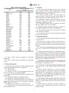 ABSTRACT This specification provides the minimum requirements for design, construction, performance, and testing of two types of tank vent flame arrester (Type I and Type II). This specification is intended for flame arresters protecting systems containing vapors of flammable or combustible liquids with the specified vapor temperature. The defined test media can be used except where arresters protect systems handling vapors with the given value of maximum experimental safe gap (MESG). Flame arresters protecting such systems must be tested with appropriate media. The flame arrester housing, and other parts or bolting used for pressure retention, shall be constructed of the prescribed materials. Arrester, elements, gaskets, and seals shall be of materials resistant to attack by seawater and the liquids and vapors contained in the tank being protected. Nonmetallic materials, other than gaskets and seals, shall not be used in the construction of pressure-retaining components and nonmetallic gaskets and seals shall be noncombustible and suitable for the service intended. The possibility of galvanic corrosion shall be considered in the selection of materials. Requirements for flame arrester design and construction, housings, elements, threaded or flanged pipe connections, joints, and fastenings are detailed. Prototype testing such as corrosion test, performance test, endurance burn test, and flashback test shall be done. SCOPE 1.1 This specification provides the minimum requirements for design, construction, performance, and testing of tank vent flame arresters. 1.2 This specification is intended for flame arresters protecting systems containing vapors of flammable or combustible liquids where vapor temperatures do not exceed 60°C. The test media defined in 9.1.1 can be used except where arresters protect systems handling vapors with a maximum experimental safe gap (MESG) below 0.9 mm. Flame arresters protecting such systems must be tested with appropriate media (the same vapor or a media having a MESG no greater than the vapor). Various gases and their respective MESG are listed in Table 1. 1.3 The values stated in SI units are to be regarded as standard. The values given in parentheses after SI units are provided for information only and are not considered standard. 1.4 The following precautionary caveat pertains only to the test methods portions, Sections 8 and 9, of this specification: This standard does not purport to address all of the safety concerns, if any, associated with its use. It is the responsibility of the user of this standard to establish appropriate safety, health, and environmental practices and determine the applicability of regulatory limitations prior to use. 1.5 This standard should be used to measure and describe the properties of materials, products, or assemblies in response to heat and flame under controlled laboratory conditions and should not be used to describe or appraise the fire hazard or fire risk of materials, products, or assemblies under actual fire conditions. However, results of this test may be used as elements of a fire risk assessment which takes into account all of the factors which are pertinent to an assessment of the fire hazard of a particular end use 1.6 This international standard was developed in accordance with internationally recognized principles on standardization established in the Decision on Principles for the Development of International Standards, Guides and Recommendations issued by the World Trade Organization Technical Barriers to Trade (TBT) Committee.