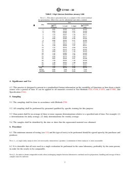 SIGNIFICANCE AND USE 4.1 This practice is designed to present in a standardized format information on the variability of limestone or lime from a single source over a period of time. It can be applied to all materials covered in Test Methods C25, C110, C1271, and C1301, and Specification C141. SCOPE 1.1 This practice is intended for use in instances where the purchaser desires information on the uniformity of limestone or lime produced at a single source. It is intended that this test method normally be used for the predominant material manufactured at a plant. Guidelines for sampling, testing and presentation of results (Table 1) are given. 1.2 This standard does not purport to address all of the safety concerns, if any, associated with its use. It is the responsibility of the user of this standard to establish appropriate safety, health, and environmental practices and determine the applicability of regulatory limitations prior to use. 1.3 This international standard was developed in accordance with internationally recognized principles on standardization established in the Decision on Principles for the Development of International Standards, Guides and Recommendations issued by the World Trade Organization Technical Barriers to Trade (TBT) Committee.