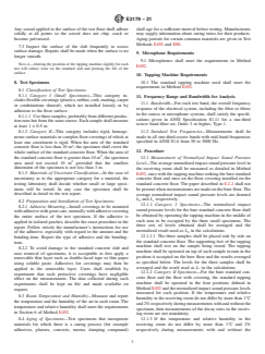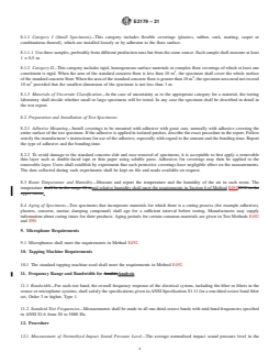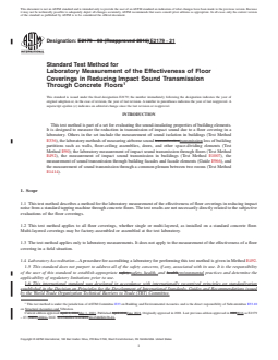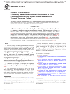 ASTM E2179-21 is a standard published by ASTM International. Its full title is "Standard Test Method for Laboratory Measurement of the Effectiveness of Floor Coverings in Reducing Impact Sound Transmission Through Concrete Floors". This standard covers: SIGNIFICANCE AND USE 5.1 The impact sound rating for a floor assembly is determined both by the basic floor assembly and the floor covering on the upper surface. The same floor covering in combination with different basic floor assemblies will not always give the same impact insulation class (IIC) ratings. This test method is designed to provide data that characterize the floor covering alone when installed over concrete slab floors. 5.2 The ΔIIC rating calculated in 13.4 is used to compare the effectiveness of different floor coverings on concrete floors. 5.3 The impact insulation class (IIC) calculated for the reference concrete floor with a covering provides an indication of the impact sound insulation that the covering will provide with typical, monolithic concrete floors. 5.4 When the normalized impact sound pressure levels below a bare concrete slab are known, the difference spectrum calculated in 13.1 may be used to estimate the impact sound pressure levels and hence the IIC that would result if the covering were installed on the slab. 5.5 Warning: Difference spectra measured using this method shall not be used to estimate impact sound pressure levels for floors comprising only one or two lightweight floor layers such as oriented strand board or plywood. Such estimated impact sound pressure levels would be very inaccurate. Note 1: The difference spectrum calculated in 13.1 gives unreliable estimates of the reduction in impact sound pressure levels due to the floor covering when it is placed on a joist floor incorporating a concrete topping (about 50 mm thick) poured directly on the plywood subfloor or steel deck. The estimated impact sound pressure levels are too low.3 5.6 This test method closely follows that described in ISO 10140-1 (Annex H) except that the single number rating used is the impact insulation class (IIC) described in Classification E989. The description of the standard concrete floor also differs. Note 2: The requirement in Classification E989... SCOPE 1.1 This test method describes a method for the laboratory measurement of the effectiveness of floor coverings in reducing impact noise from a standard tapping machine through concrete floors. The test results are not necessarily directly related to the subjective evaluations of the floor coverings. 1.2 This test method applies to all floor coverings, whether single or multi-layered, as installed on a standard concrete floor. Multi-layered coverings may be factory-assembled or assembled at the test laboratory. 1.3 The test method applies only to laboratory measurements. It does not apply to the measurement of the effectiveness of a floor covering in a field situation. 1.4 Laboratory Accreditation—A procedure for accrediting a laboratory for performing this test method is given in Method E492. 1.5 This standard does not purport to address all of the safety concerns, if any, associated with its use. It is the responsibility of the user of this standard to establish appropriate safety, health, and environmental practices and determine the applicability of regulatory limitations prior to use. 1.6 This international standard was developed in accordance with internationally recognized principles on standardization established in the Decision on Principles for the Development of International Standards, Guides and Recommendations issued by the World Trade Organization Technical Barriers to Trade (TBT) Committee.