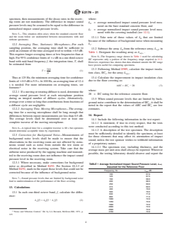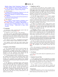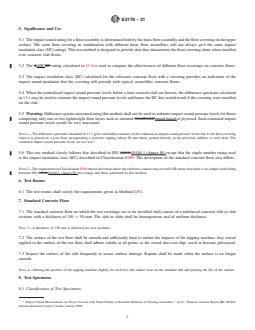 SIGNIFICANCE AND USE 5.1 The impact sound rating for a floor assembly is determined both by the basic floor assembly and the floor covering on the upper surface. The same floor covering in combination with different basic floor assemblies will not always give the same impact insulation class (IIC) ratings. This test method is designed to provide data that characterize the floor covering alone when installed over concrete slab floors. 5.2 The ΔIIC rating calculated in 13.4 is used to compare the effectiveness of different floor coverings on concrete floors. 5.3 The impact insulation class (IIC) calculated for the reference concrete floor with a covering provides an indication of the impact sound insulation that the covering will provide with typical, monolithic concrete floors. 5.4 When the normalized impact sound pressure levels below a bare concrete slab are known, the difference spectrum calculated in 13.1 may be used to estimate the impact sound pressure levels and hence the IIC that would result if the covering were installed on the slab. 5.5 Warning: Difference spectra measured using this method shall not be used to estimate impact sound pressure levels for floors comprising only one or two lightweight floor layers such as oriented strand board or plywood. Such estimated impact sound pressure levels would be very inaccurate. Note 1: The difference spectrum calculated in 13.1 gives unreliable estimates of the reduction in impact sound pressure levels due to the floor covering when it is placed on a joist floor incorporating a concrete topping (about 50 mm thick) poured directly on the plywood subfloor or steel deck. The estimated impact sound pressure levels are too low.3 5.6 This test method closely follows that described in ISO 10140-1 (Annex H) except that the single number rating used is the impact insulation class (IIC) described in Classification E989. The description of the standard concrete floor also differs. Note 2: The requirement in Classification E989... SCOPE 1.1 This test method describes a method for the laboratory measurement of the effectiveness of floor coverings in reducing impact noise from a standard tapping machine through concrete floors. The test results are not necessarily directly related to the subjective evaluations of the floor coverings. 1.2 This test method applies to all floor coverings, whether single or multi-layered, as installed on a standard concrete floor. Multi-layered coverings may be factory-assembled or assembled at the test laboratory. 1.3 The test method applies only to laboratory measurements. It does not apply to the measurement of the effectiveness of a floor covering in a field situation. 1.4 Laboratory Accreditation—A procedure for accrediting a laboratory for performing this test method is given in Method E492. 1.5 This standard does not purport to address all of the safety concerns, if any, associated with its use. It is the responsibility of the user of this standard to establish appropriate safety, health, and environmental practices and determine the applicability of regulatory limitations prior to use. 1.6 This international standard was developed in accordance with internationally recognized principles on standardization established in the Decision on Principles for the Development of International Standards, Guides and Recommendations issued by the World Trade Organization Technical Barriers to Trade (TBT) Committee.