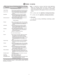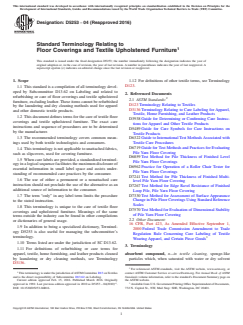 ASTM D5253-04(2016) is a standard published by ASTM International. Its full title is "Standard Terminology Relating to Floor Coverings and Textile Upholstered Furniture". This standard covers: SCOPE 1.1 This standard is a compilation of all terminology developed by Subcommittee D13.62 on Labeling and related to refurbishing or care of floor coverings and textile upholstered furniture, excluding leather. These items cannot be refurbished by the laundering and dry cleaning methods used for apparel and other domestic textile products. 1.2 This document defines terms for the care of textile floor coverings and textile upholstered furniture. The exact care instructions and sequence of procedures are to be determined by the manufacturer. 1.3 The recommended terminology covers common meanings used by both textile technologists and consumers. 1.4 This terminology is not applicable to unattached fabrics, such as slipcovers, used for covering furniture. 1.5 When care labels are provided, a standardized terminology in a logical sequence facilitates the maximum disclosure of essential information in small label space and assists understanding of recommended care practices by the consumer. 1.6 The use of either a permanent or a nonattached care instruction should not preclude the use of the alternative as an additional source of information to the consumer. 1.7 The term “only” in any label term limits the procedure to the stated instruction. 1.8 This terminology is unique to the care of textile floor coverings and upholstered furniture. Meanings of the same terms outside the industry can be found in other compilations or dictionaries of general usage. 1.9 In addition to being a specialized dictionary, Terminology D5253 is also useful for managing the subcommittee's terminology. 1.10 Terms listed are under the jurisdiction of SC D13.62. 1.11 For definitions of refurbishing or care terms for apparel, textile, home furnishing, and leather products cleaned by laundering or dry cleaning methods, see Terminology D3136. 1.12 For definitions of other textile terms, see Terminology D123.