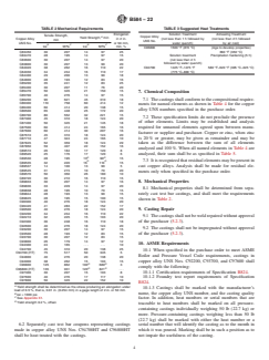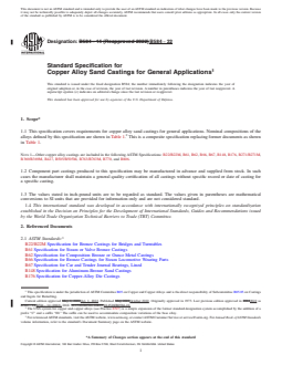 ABSTRACT This specification covers requirements for copper alloy sand castings for general applications. The components part casting may be manufactured in advance and supplied from stock. The castings shall conform to the compositional requirements for named elements specified. Mechanical properties of copper alloys such as tensile strength, yield strength, and elongation shall be determined. The castings shall not be repaired, plugged, welded, or burned in. SCOPE 1.1 This specification covers requirements for copper alloy sand castings for general applications. Nominal compositions of the alloys defined by this specification are shown in Table 1.2 This is a composite specification replacing former documents as shown in Table 1. Note 1: Other copper alloy castings are included in the following ASTM Specifications: B22/B22M, B61, B62, B66, B67, B148, B176, B271/B271M, B369/B369M, B427, B505/B505M, B763/B763M, B770, and B806. 1.2 Component part castings produced to this specification may be manufactured in advance and supplied from stock. In such cases the manufacturer shall maintain a general quality certification of all castings without specific record or date of casting for a specific casting. 1.3 The values stated in inch-pound units are to be regarded as standard. The values given in parentheses are mathematical conversions to SI units that are provided for information only and are not considered standard. 1.4 This international standard was developed in accordance with internationally recognized principles on standardization established in the Decision on Principles for the Development of International Standards, Guides and Recommendations issued by the World Trade Organization Technical Barriers to Trade (TBT) Committee.