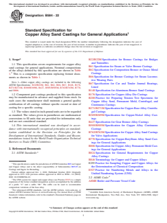 ASTM B584-22 is a technical specification published by ASTM International. Its full title is "Standard Specification for Copper Alloy Sand Castings for General Applications". This standard covers: ABSTRACT This specification covers requirements for copper alloy sand castings for general applications. The components part casting may be manufactured in advance and supplied from stock. The castings shall conform to the compositional requirements for named elements specified. Mechanical properties of copper alloys such as tensile strength, yield strength, and elongation shall be determined. The castings shall not be repaired, plugged, welded, or burned in. SCOPE 1.1 This specification covers requirements for copper alloy sand castings for general applications. Nominal compositions of the alloys defined by this specification are shown in Table 1.2 This is a composite specification replacing former documents as shown in Table 1. Note 1: Other copper alloy castings are included in the following ASTM Specifications: B22/B22M, B61, B62, B66, B67, B148, B176, B271/B271M, B369/B369M, B427, B505/B505M, B763/B763M, B770, and B806. 1.2 Component part castings produced to this specification may be manufactured in advance and supplied from stock. In such cases the manufacturer shall maintain a general quality certification of all castings without specific record or date of casting for a specific casting. 1.3 The values stated in inch-pound units are to be regarded as standard. The values given in parentheses are mathematical conversions to SI units that are provided for information only and are not considered standard. 1.4 This international standard was developed in accordance with internationally recognized principles on standardization established in the Decision on Principles for the Development of International Standards, Guides and Recommendations issued by the World Trade Organization Technical Barriers to Trade (TBT) Committee.