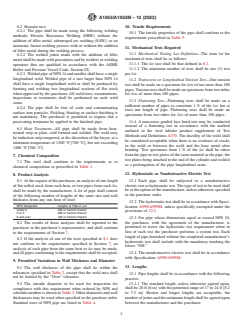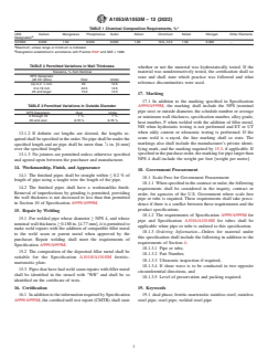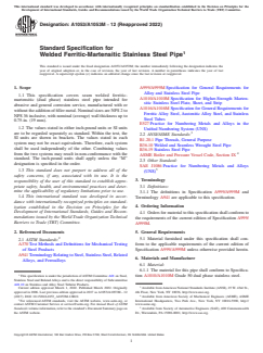 ABSTRACT This specification covers seam welded ferritic-martensitic stainless steel pipe intended for abrasive and general corrosion service. The pipes are classified according to sizes, from NPS 2 to NPS 36. The pipe shall be made using Electric Resistance Welding (ERW) or an automatic fusion welding process with no addition of filler metal during the welding process. All pipes shall be made from heat treated strip or plate, cold formed and welded. Tensile test, flattening test, hydrostatic test, and nondestructive electric test shall be made in accordance with the pipe specification to conform to the requirements specified. SCOPE 1.1 This specification covers seam welded ferritic-martensitic (dual phase) stainless steel pipe intended for abrasive and general corrosion service, manufactured with or without the addition of filler metal. Nominal sizes are NPS 2 to NPS 36 inclusive, with nominal (average) wall thickness up to 0.75-in. (19 mm). 1.2 The values stated in either inch-pound units or SI units are to be regarded separately as standard. Within the text, the SI units are shown in brackets. The values stated in each system may not be exact equivalents. Therefore, each system shall be used independently of the other. Combining values from the two systems may result in non-conformance with the standard. The inch-pound units shall apply unless the “M” designation is specified in the order. 1.3 This standard does not purport to address all of the safety concerns, if any, associated with its use. It is the responsibility of the user of this standard to establish appropriate safety, health, and environmental practices and determine the applicability of regulatory limitations prior to use. 1.4 This international standard was developed in accordance with internationally recognized principles on standardization established in the Decision on Principles for the Development of International Standards, Guides and Recommendations issued by the World Trade Organization Technical Barriers to Trade (TBT) Committee.